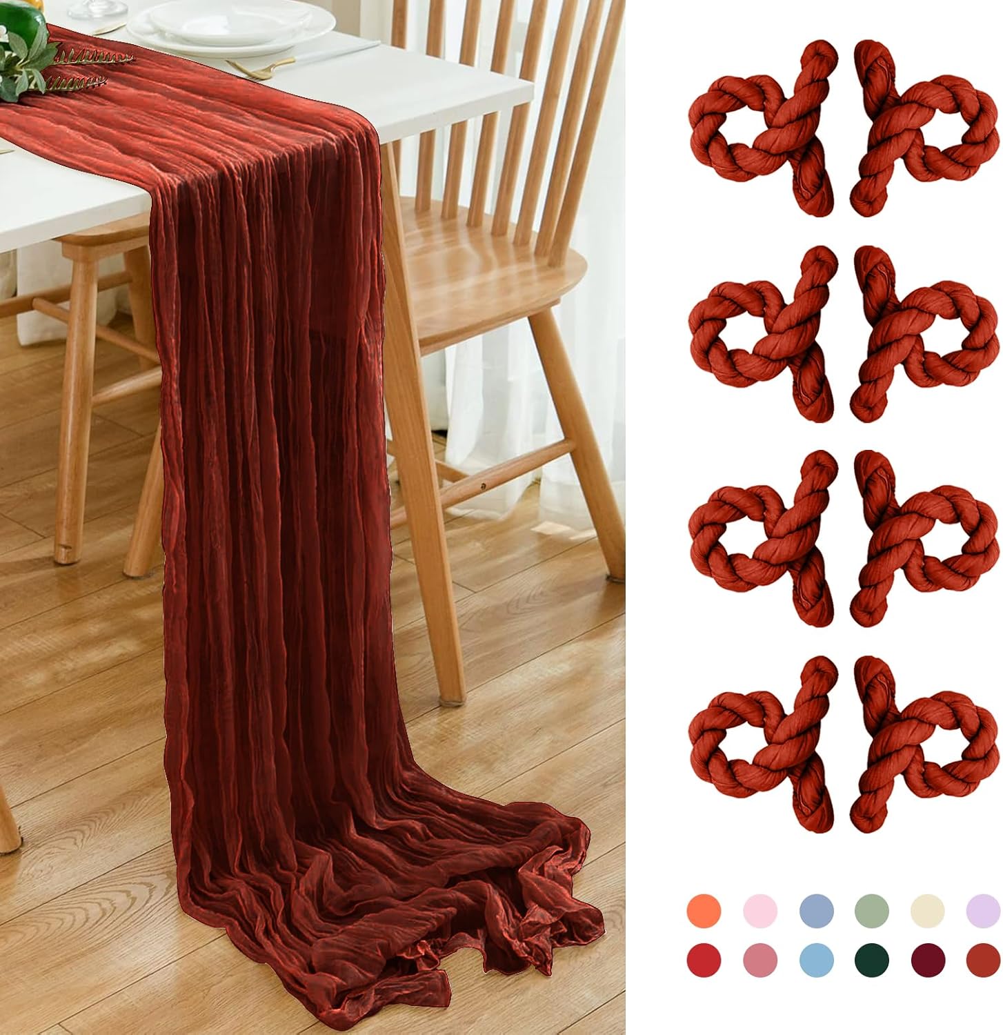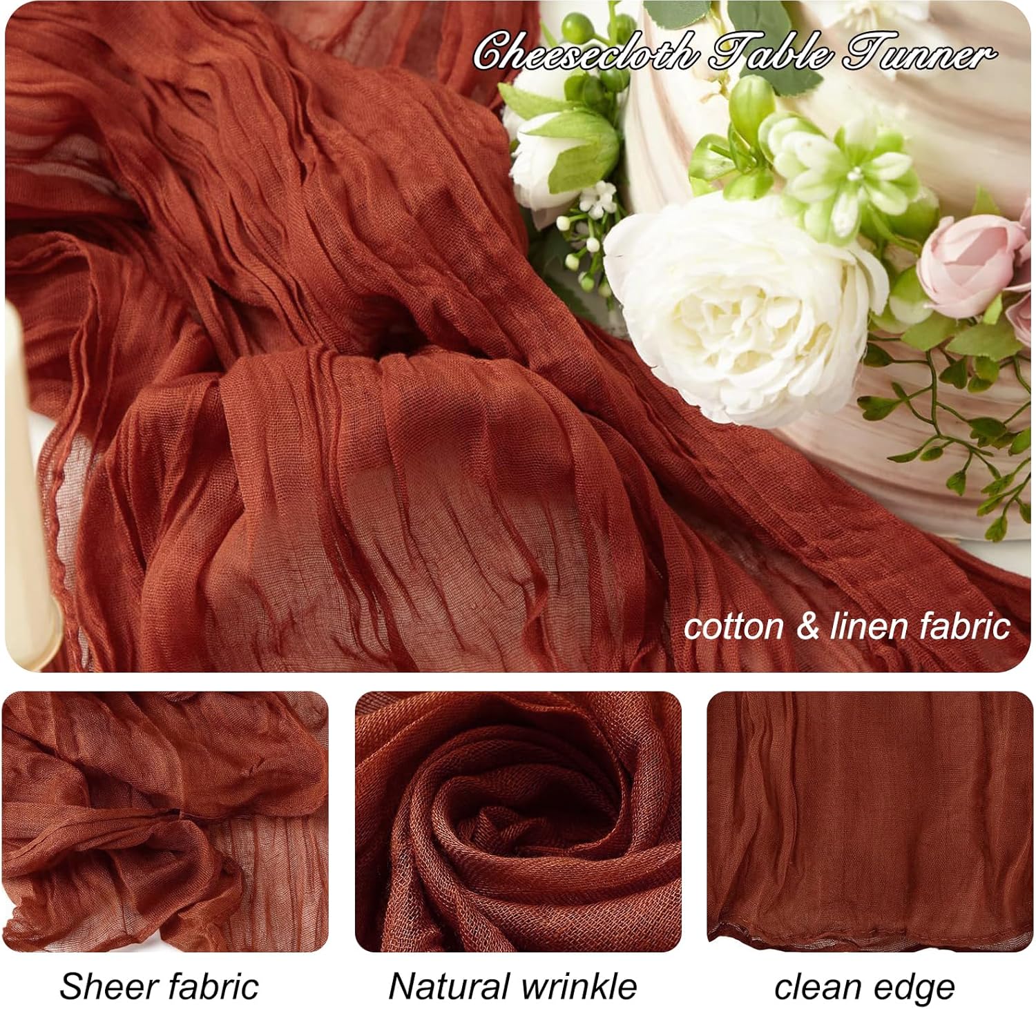- 【Package Include】: you will get 8 pieces 35 x 120 inches/90 x 300 cm length terracotta cheesecloth table runner, which is large enough to cover and dressed up rectangle and round tables, can also be spliced together for long tables. Even can be used for chair cover sashes or decorative napkins, backdrop draping, ceiling draping or even gift wrapping.