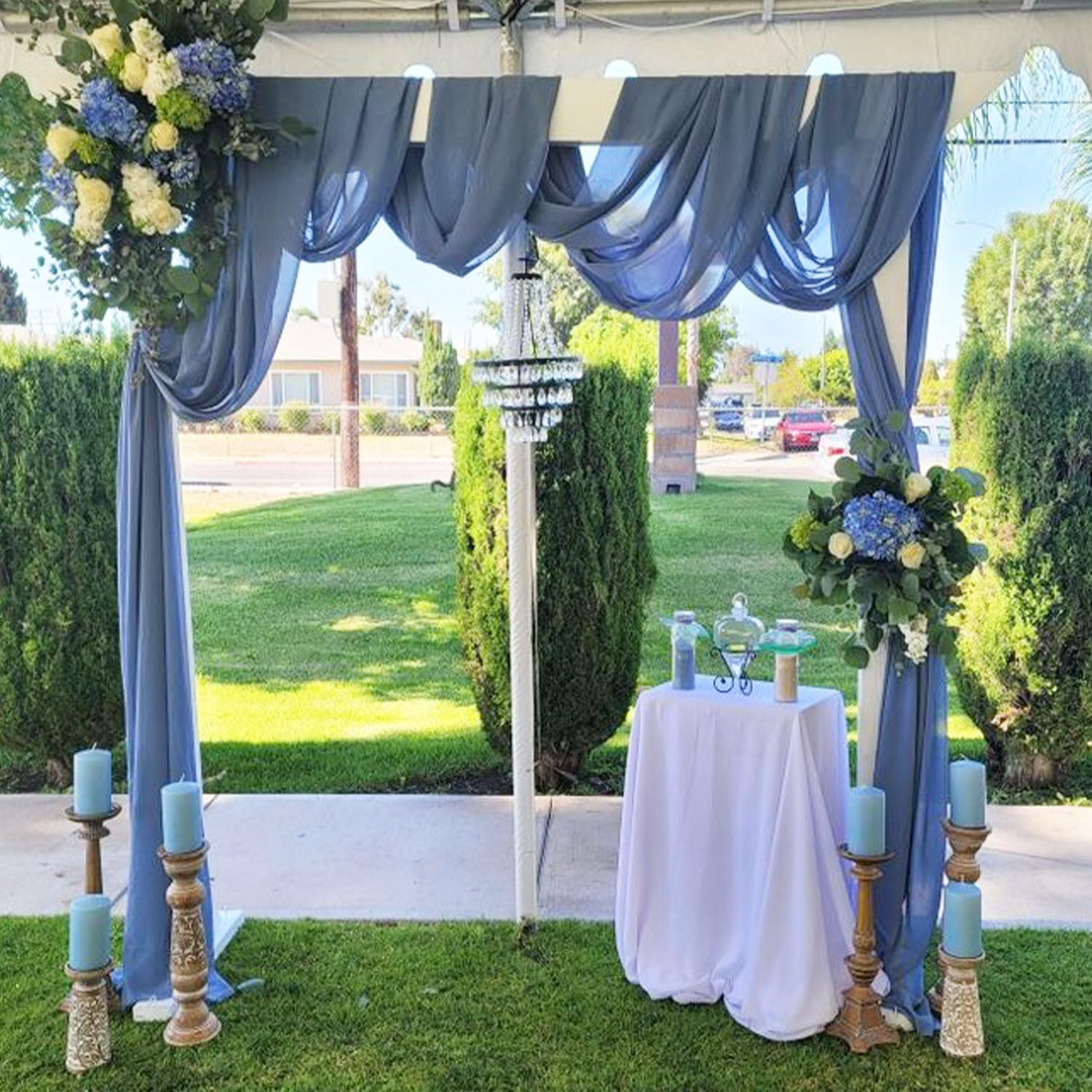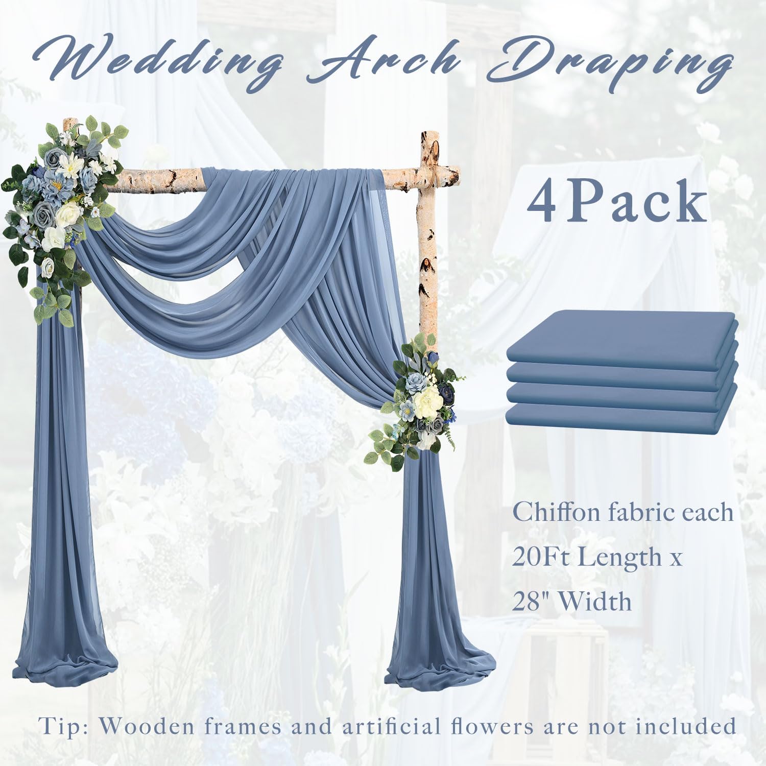 - Wedding Arch Drapes Fabric Package: Set consists of 4 dusty blue transparent arched curtains, each 20Ft Length x 28" Width, The dimensions of each piece have been precisely measured and there is not much difference. Perfect for wedding arches of many styles and shapes.