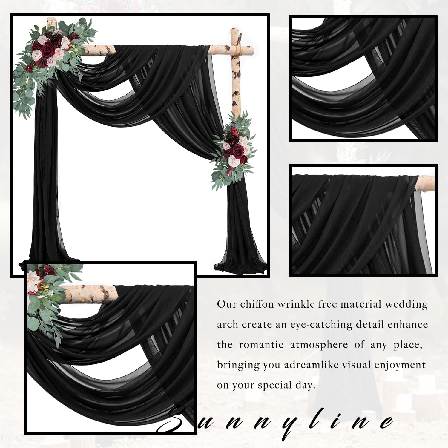 - Wedding Arch Draping Fabric Material: The wedding arch draping fabric is high-quality chiffon fabric, it is very smooth to the touch, soft and does not wrinkle. They create an eye-catching detail that brings long-lasting visual enjoyment, they are perfect for wedding decorations and ceremonies.