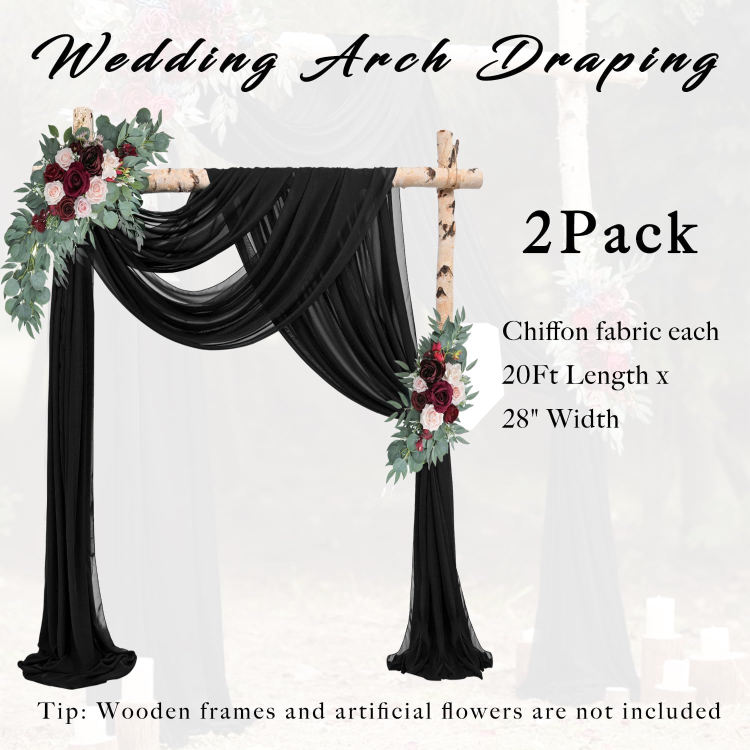 - Wedding Arch Drapes Fabric Package: Set consists of 2 black transparent arched curtains, each 20Ft Length x 28" Width, The dimensions of each piece have been precisely measured and there is not much difference. Perfect for wedding arches of many styles and shapes.