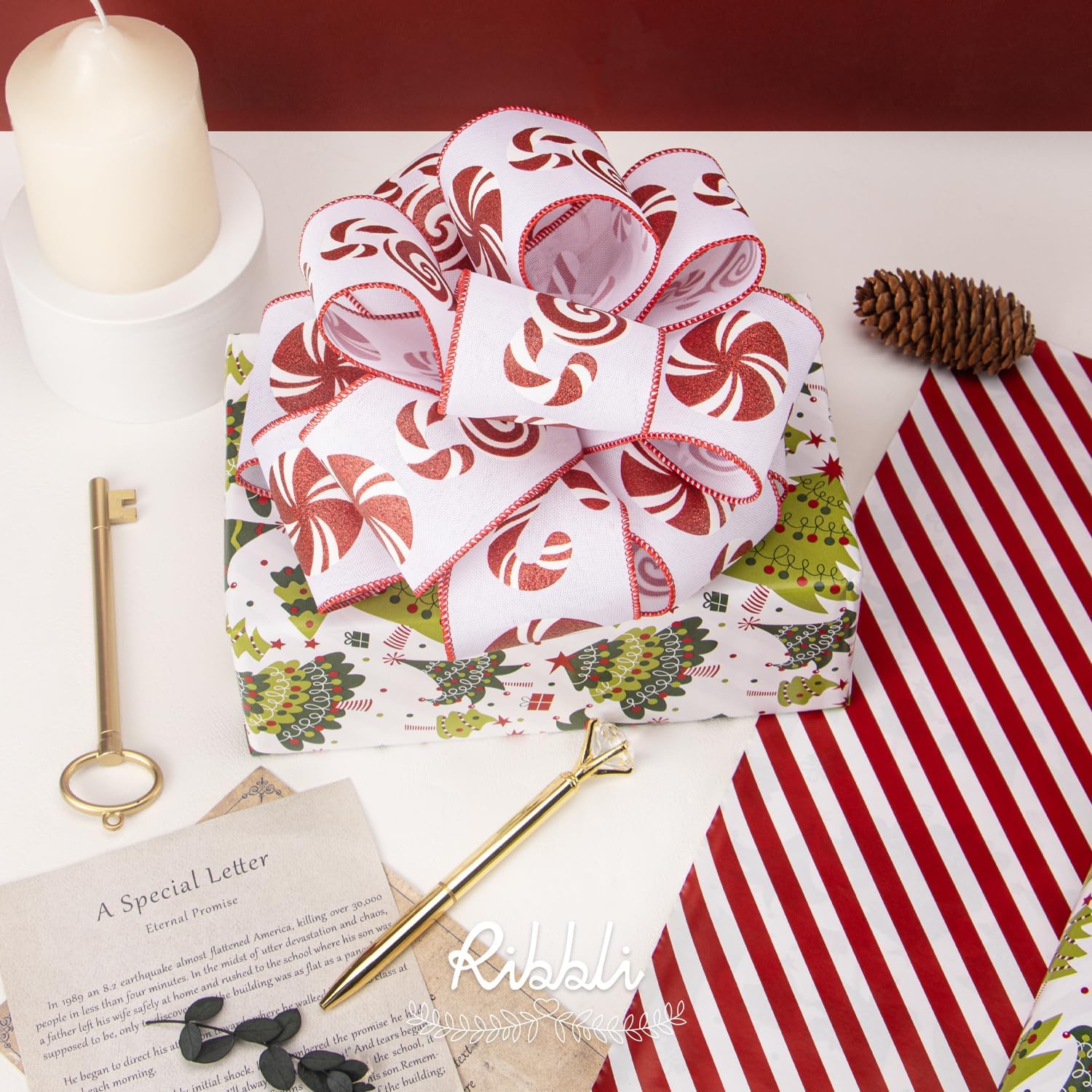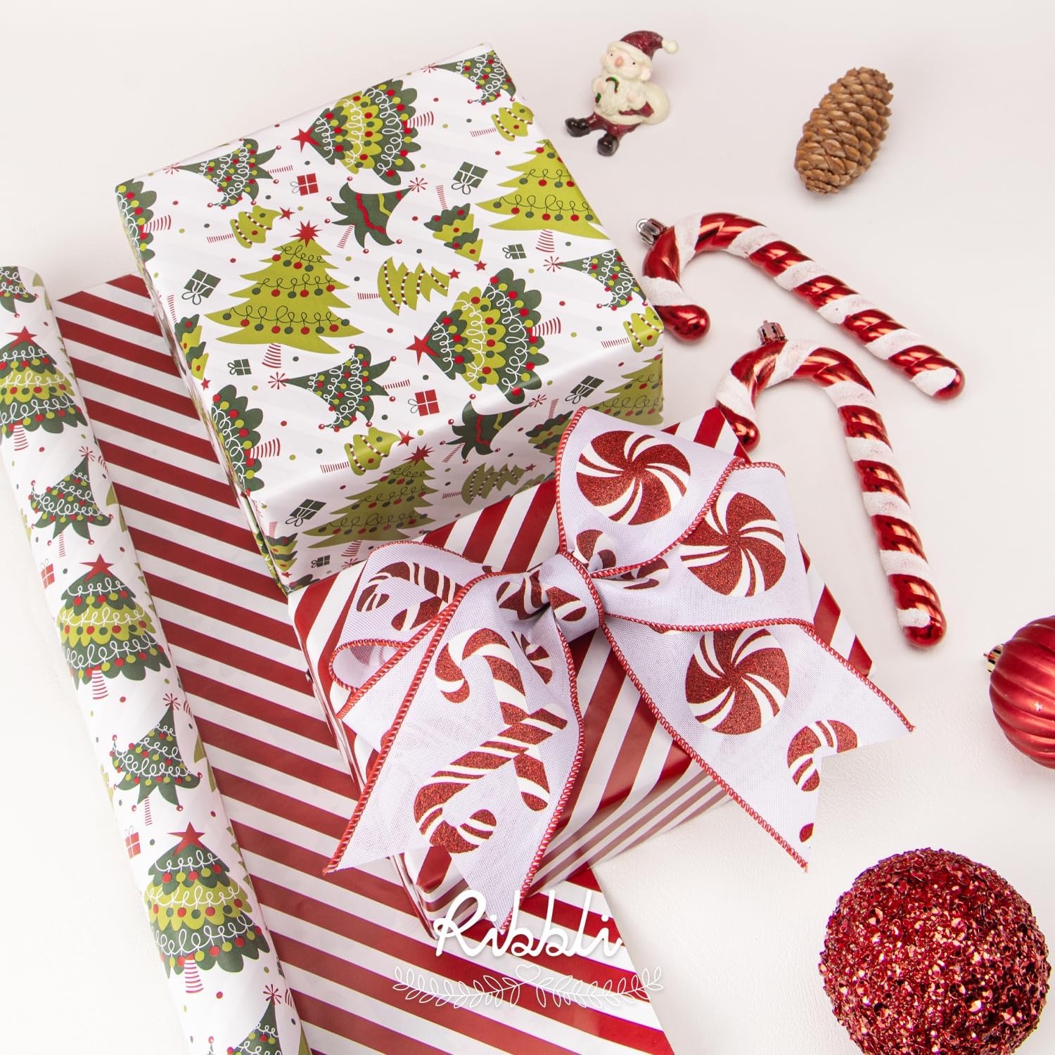 Ribbli Christmas Wrapping Paper Reversible Christmas Tree and Red White Stripe Gift Wrapping Paper-17 Inch x 33 Feet Per roll