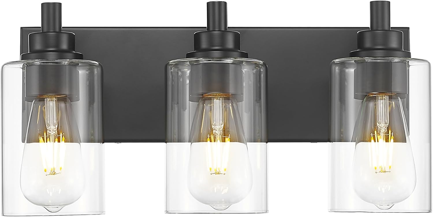 3-Light Bathroom Light Fixtures, Black Vanity Light with Cylinder Clear Glass Shade, Modern Vanity Lighting Fixtures Over Mirror, VL143-MB-3