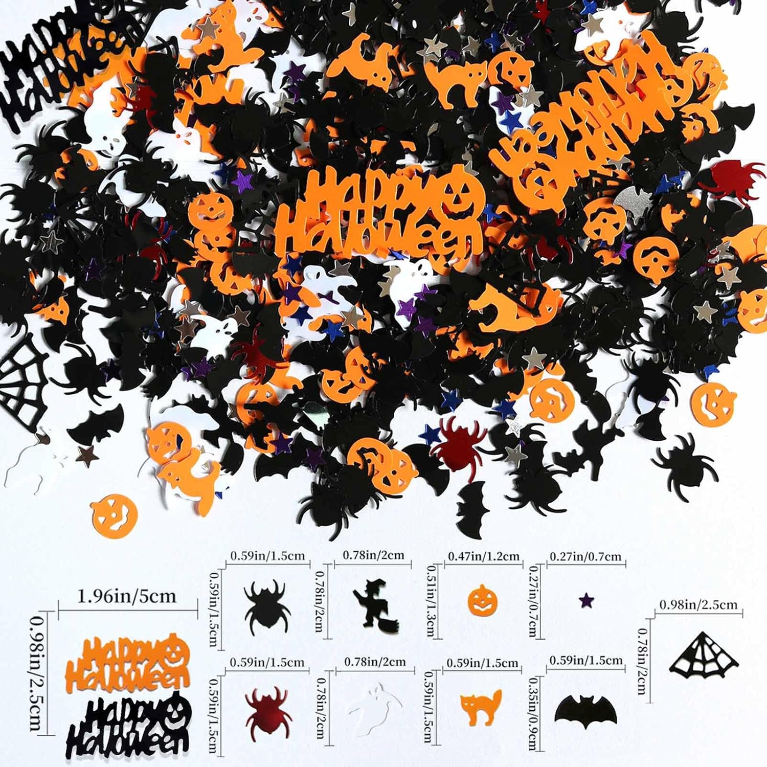 - đ ăHalloween Confetti Decorationsă This Halloween confetti comes in 5 colors: black, orange, purple, white,red. Includes: "Happy Halloween" confetti, pumpkin confetti, spider confetti, bat confetti. spider webs decorations.It's suitable for your Halloween party table decor, cute Halloween themed designs,full of festival atmosphere