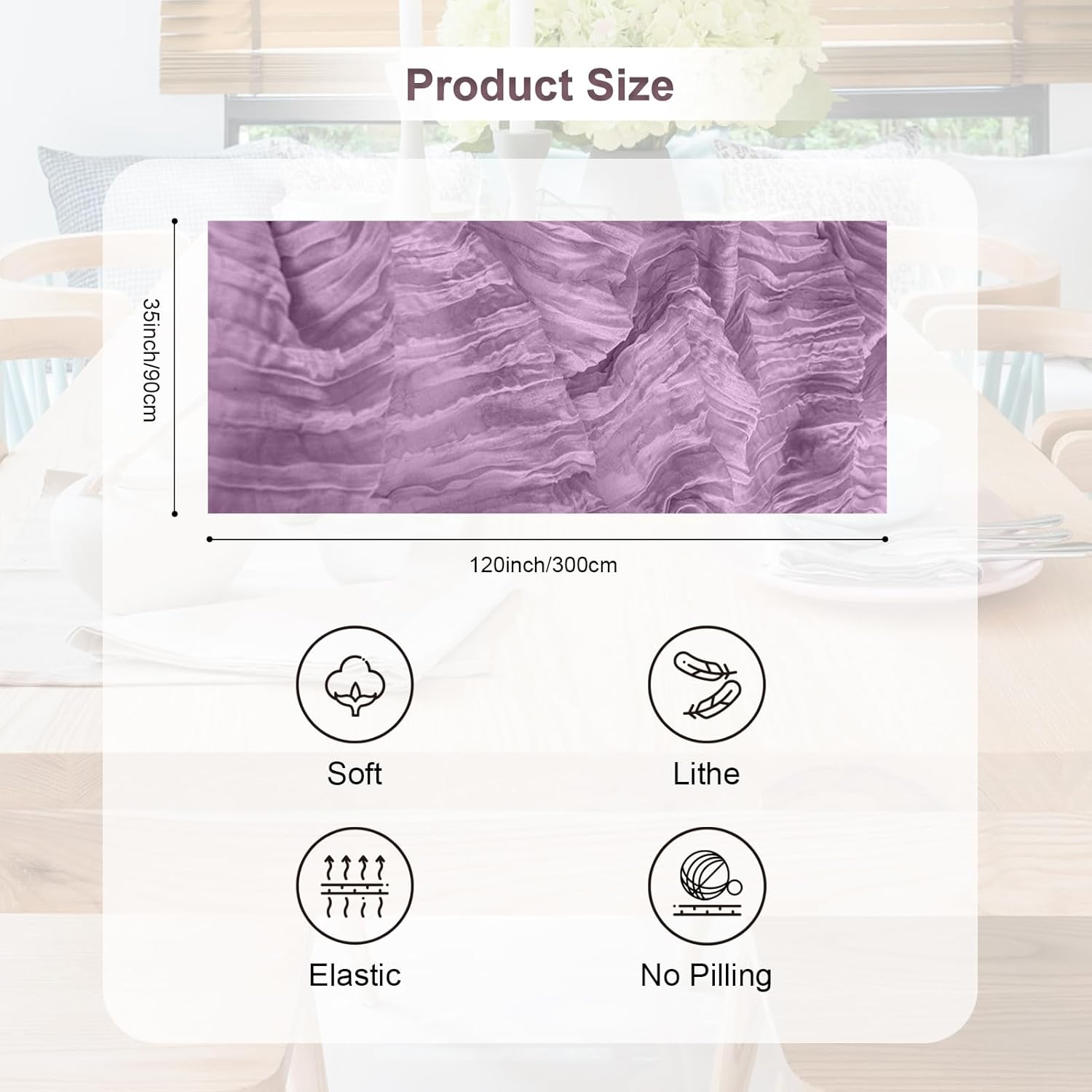 - Premium Materials: Our table runners are crafted from high-quality cheesecloth and gauze. The Lilac cheesecloth table runner has good softness and breathability, while the gauze table runner offers a delicate and elegant texture. These materials are carefully selected to ensure durability and a luxurious feel, making your table look and feel extraordinary.