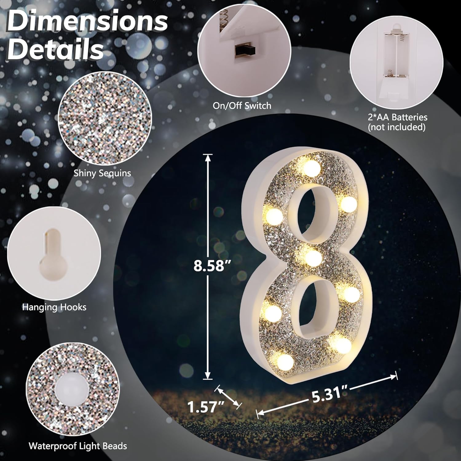 - 【Glitter Silver Marquee LED Letters】Unlike normal white lighted letters, these LED letter lights are covered with shiny silver glittering sequins. Whether it is turned on or off, these glitter marquee lights give a bright eye-catching glow. You can use it to beautify your dining table and light up your party. Create a dreamlike and romantic atmosphere.