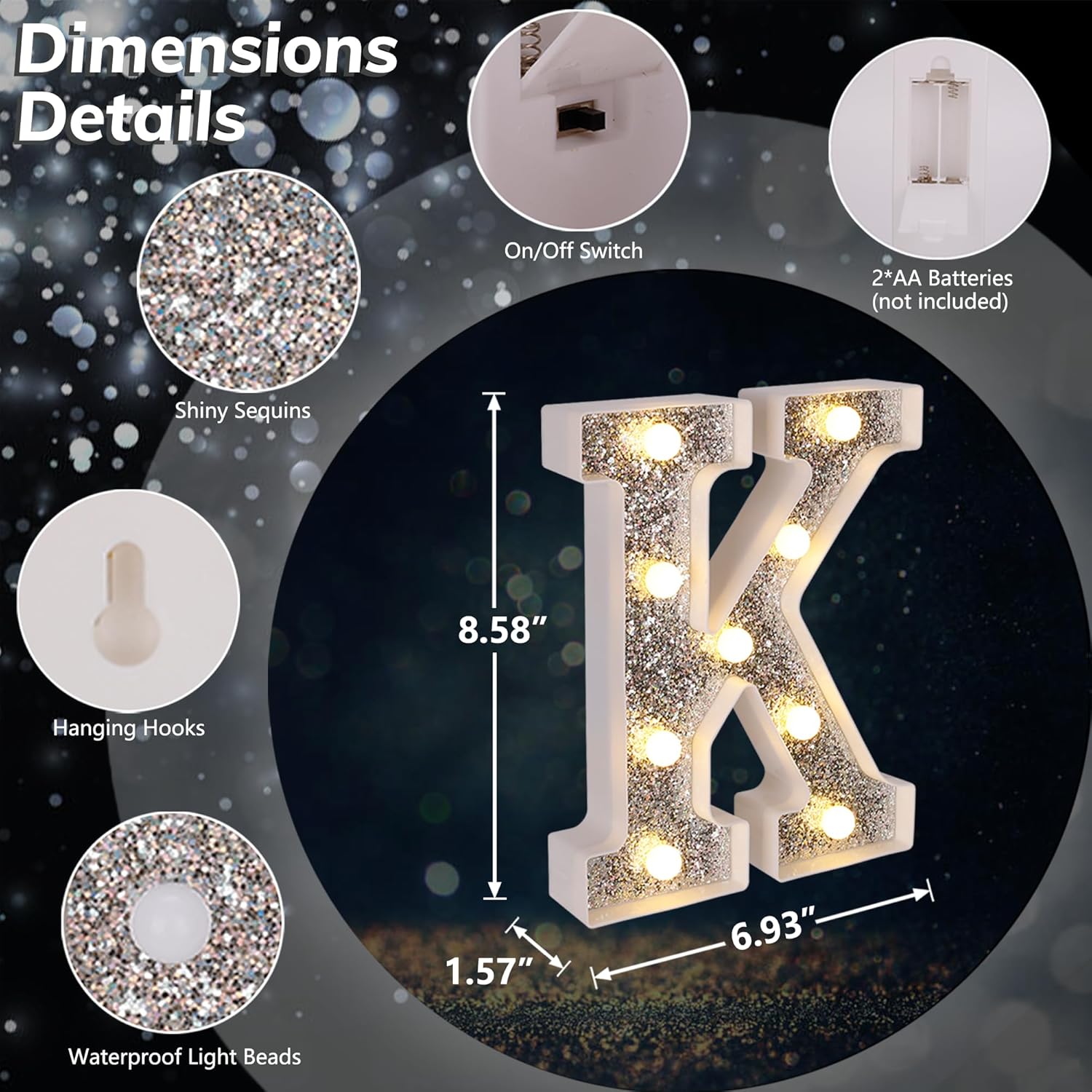 - 【Glitter Silver Marquee LED Letters】Unlike normal white lighted letters, these LED letter lights are covered with shiny silver glittering sequins. Whether it is turned on or off, these glitter marquee lights give a bright eye-catching glow. You can use it to beautify your dining table and light up your party. Create a dreamlike and romantic atmosphere.