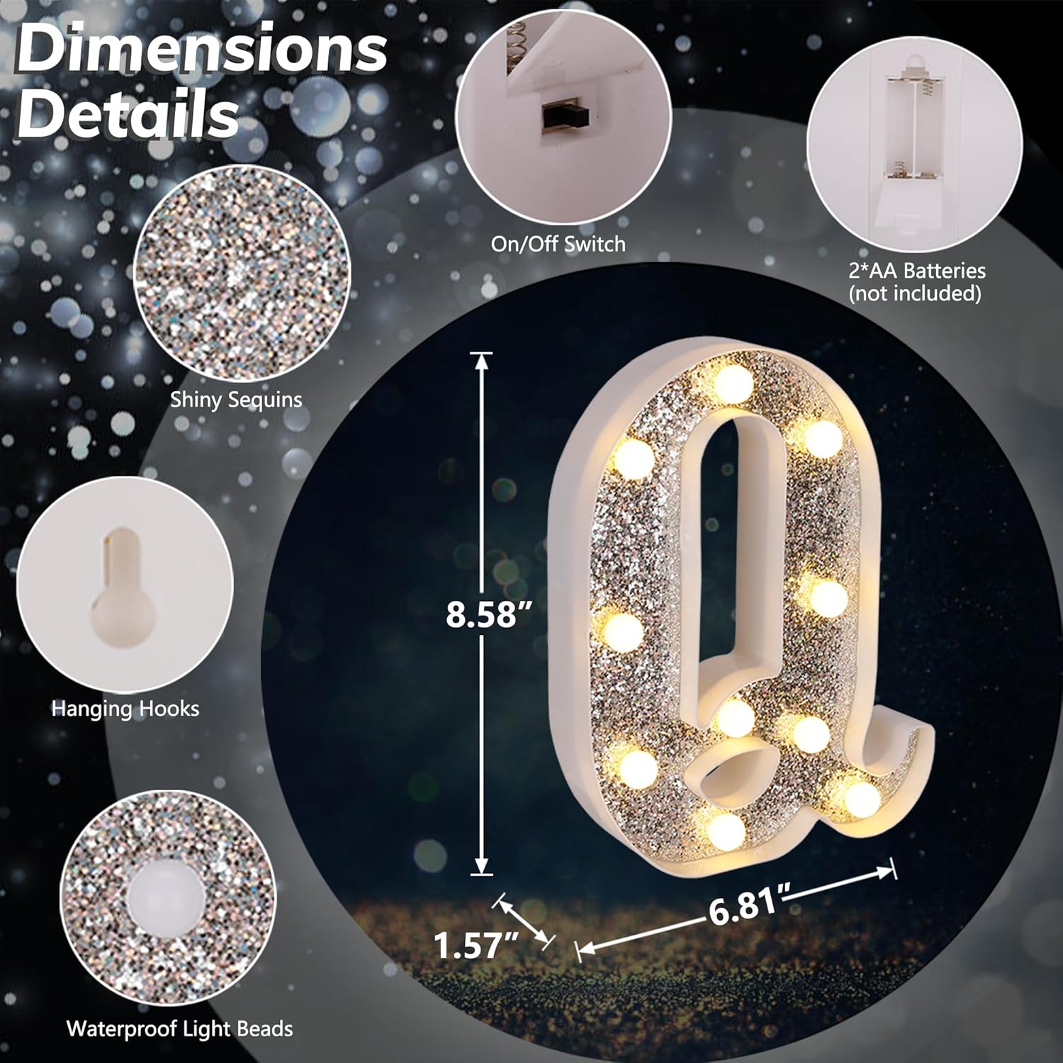Marquee Light Up Letters, Glitter Silver LED Letter with Lights, Wedding, Birthday, Party, Cafe, Bar or Room Decor - Letter Q
