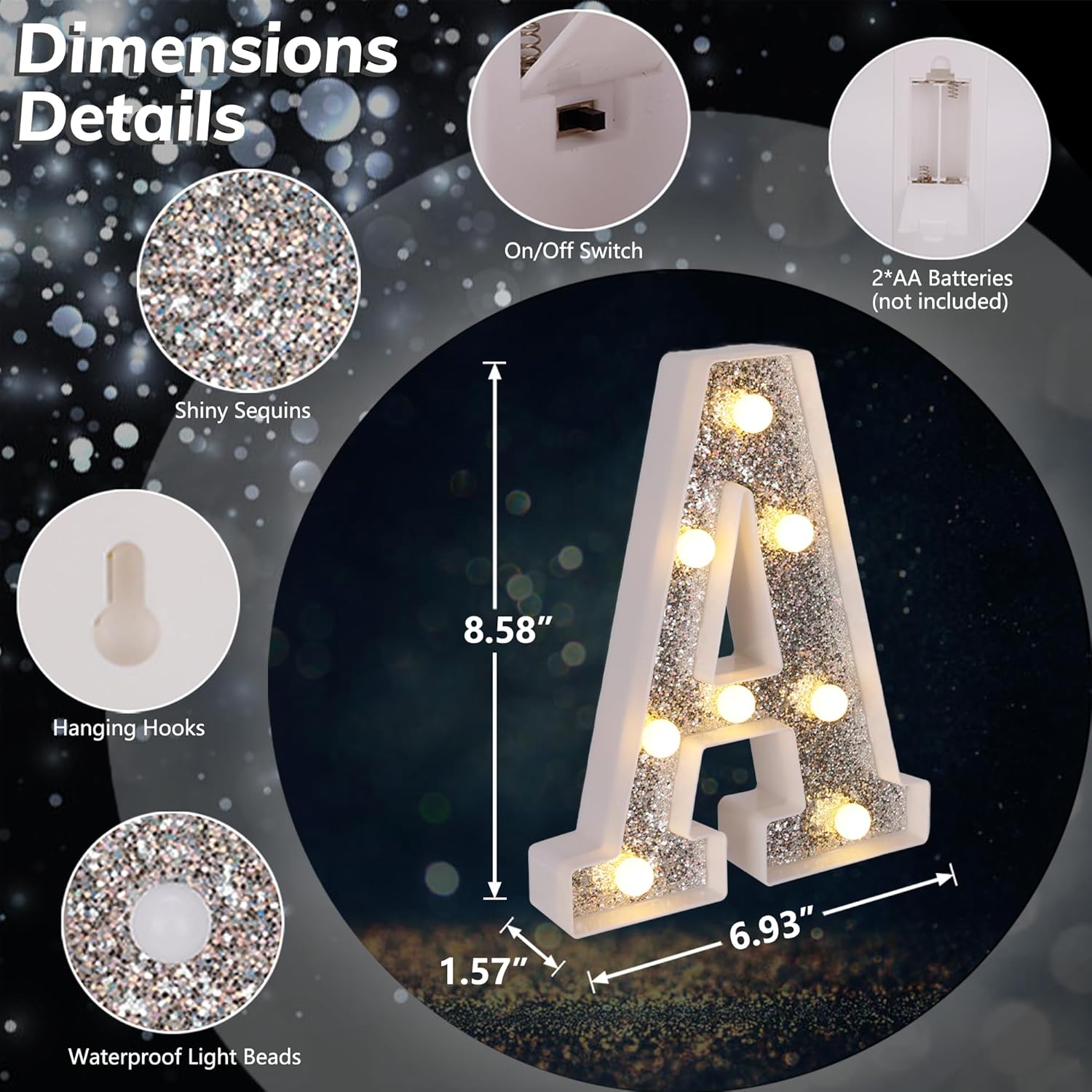 Marquee Light Up Letters, Glitter Silver LED Letter Lights Battery Powered Alphabet Letter Sign for Night Light Wedding Birthday Party Cafe Bar Decoration Girls Room Decor - A