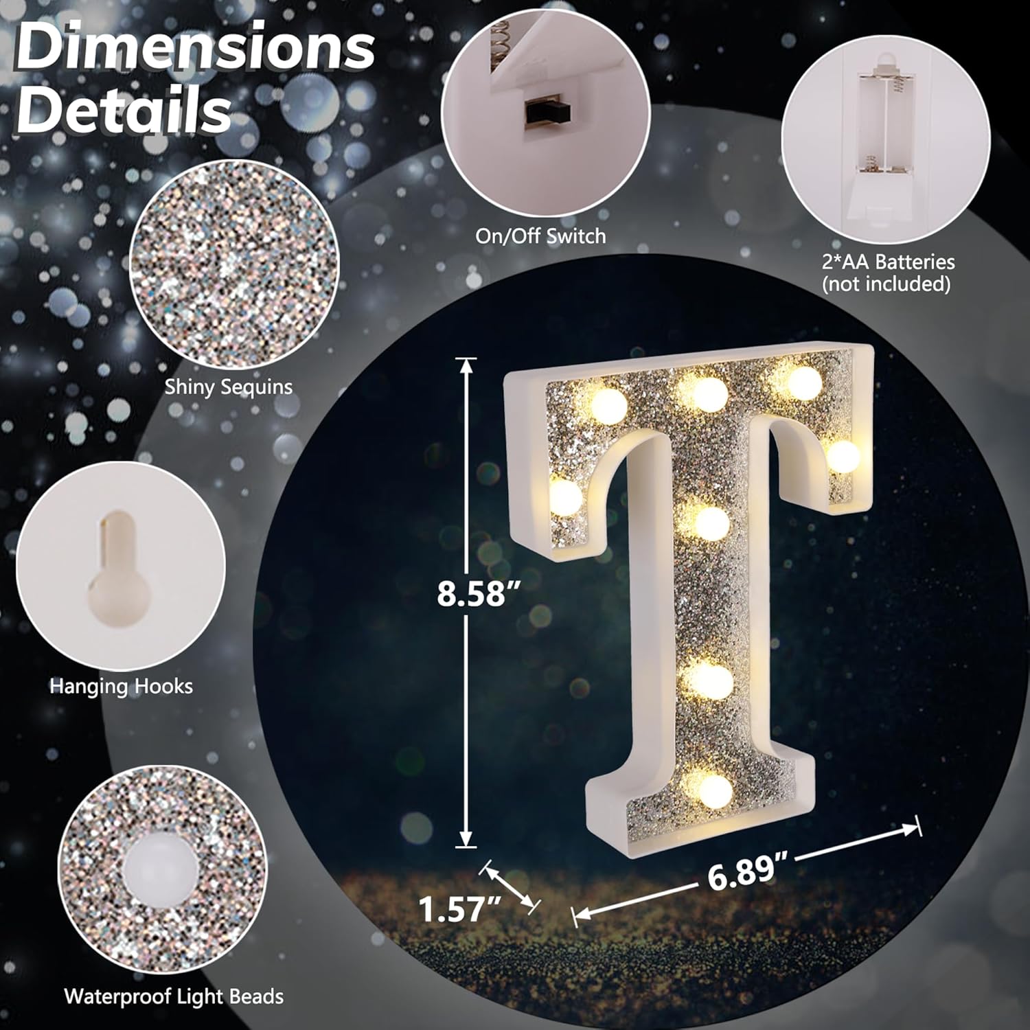 - ăGlitter Silver Marquee LED LettersăUnlike normal white lighted letters, these LED letter lights are covered with shiny silver glittering sequins. Whether it is turned on or off, these glitter marquee lights give a bright eye-catching glow. You can use it to beautify your dining table and light up your party. Create a dreamlike and romantic atmosphere.
