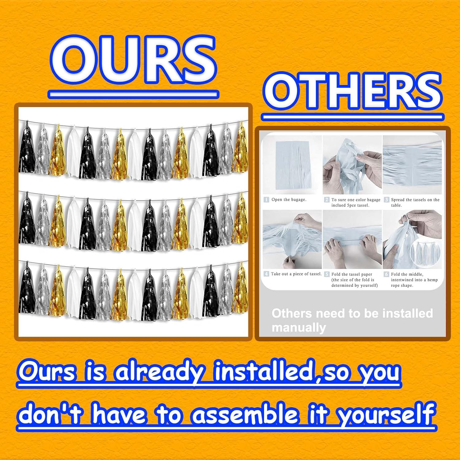 - 【Package Includes】The total length of the black gold silver birthday tassels banner is 30 feet, divided into 3 strips, each 10 feet long. Each banner contains 15 tassels, and each tassel measures 14 inches, for birthday decorations many occasions uitable for Patriotic display, Homecoming Float, Christmas Float, ecorative metal trailers, graduation floats etc