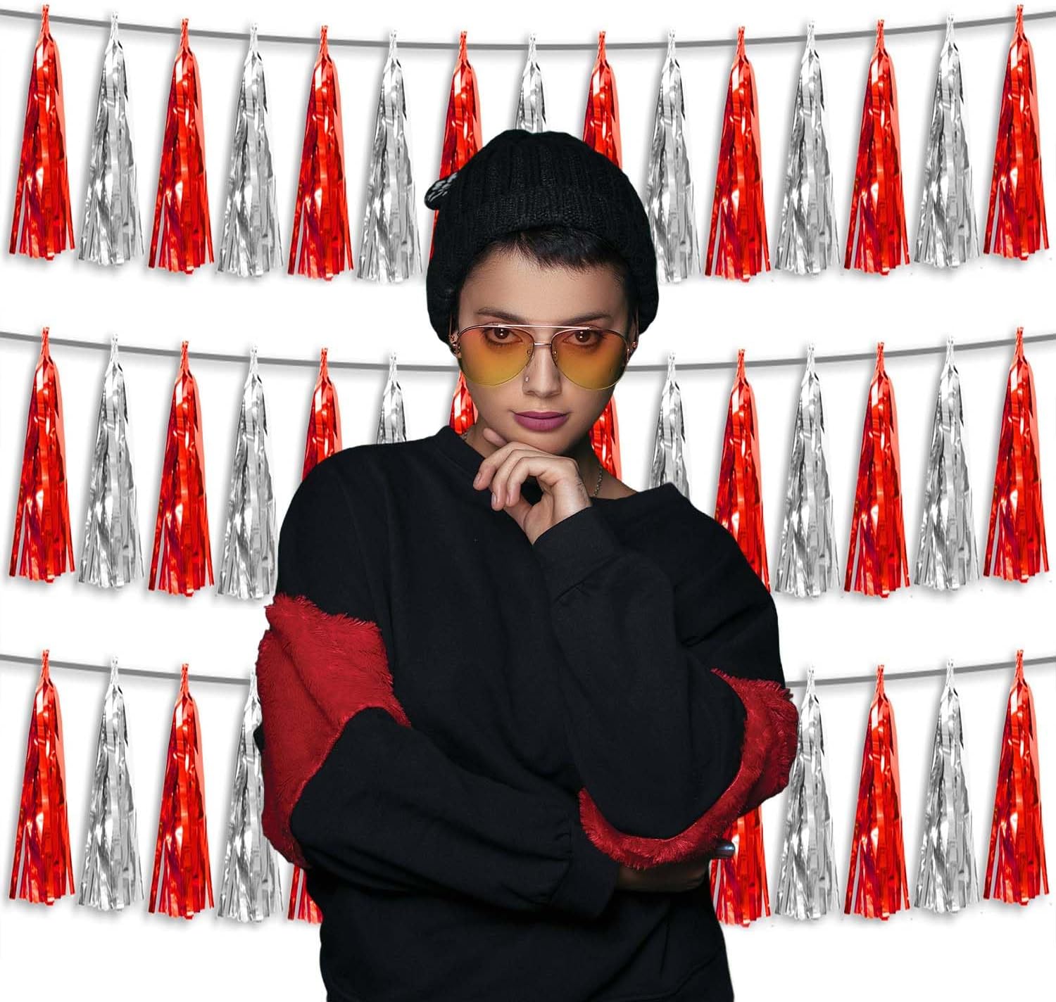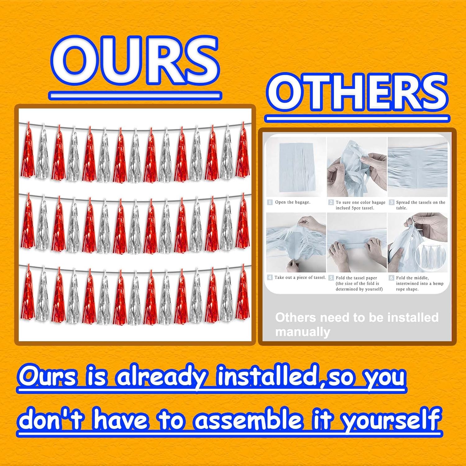 - 【Package Includes】The total length of the red silver birthday tassels banner is 30 feet, divided into 3 strips, each 10 feet long. Each banner contains 15 tassels, and each tassel measures 14 inches, for birthday decorations many occasions uitable for Patriotic display, Homecoming Float, Christmas Float, ecorative metal trailers, graduation floats etc