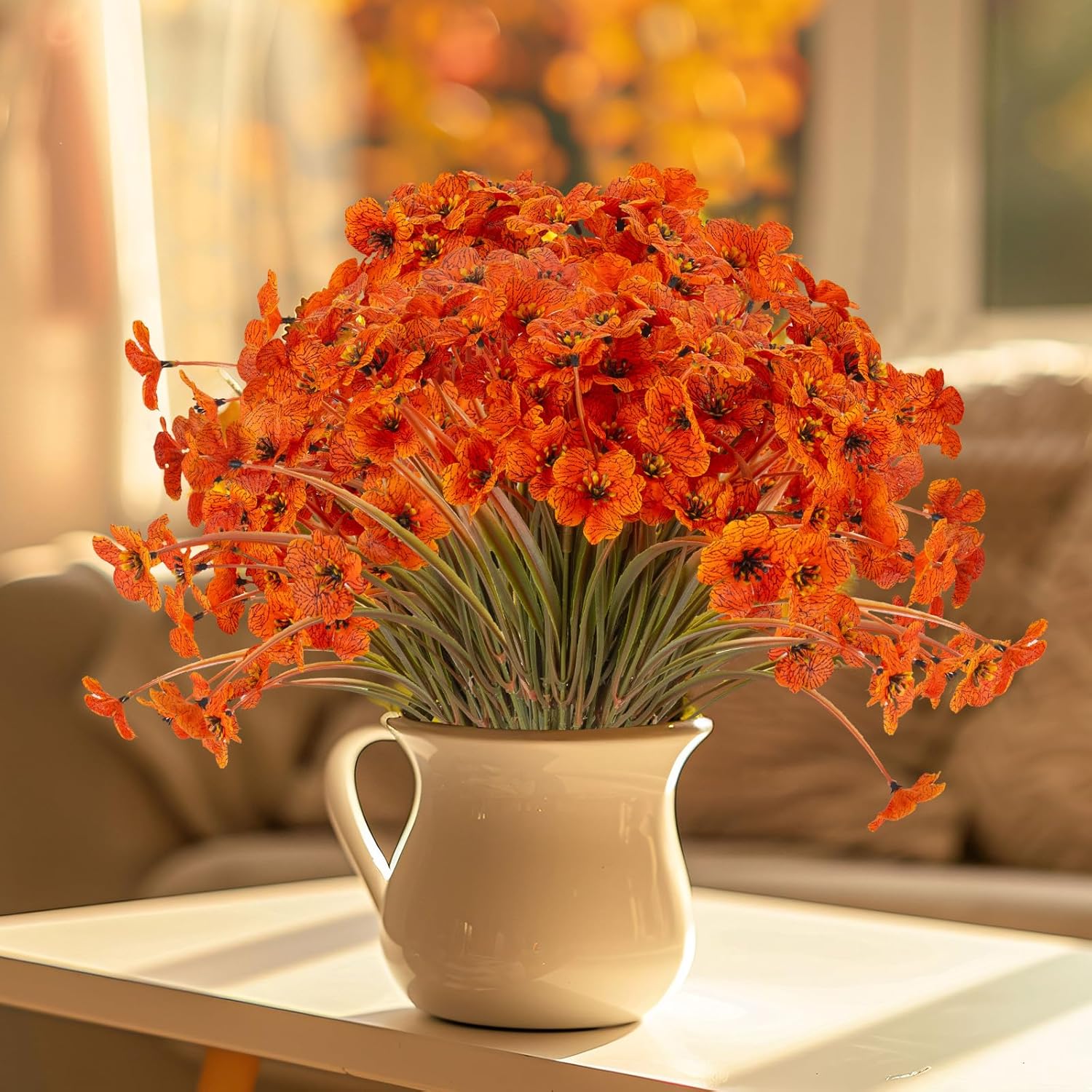 - 【Care Free】: The orange flower heads abandon the traditional plastic flower heads (the single color is easy to fade and the decoration is unstable). These artificial fall plants are UV resistant. The high-end appearance artificial flowers are very suitable for any landscaping project or decoration style, without worrying about the sun, watering, pruning or other maintenance; no matter where you choose to display, these artificial fall flowers will always bloom.