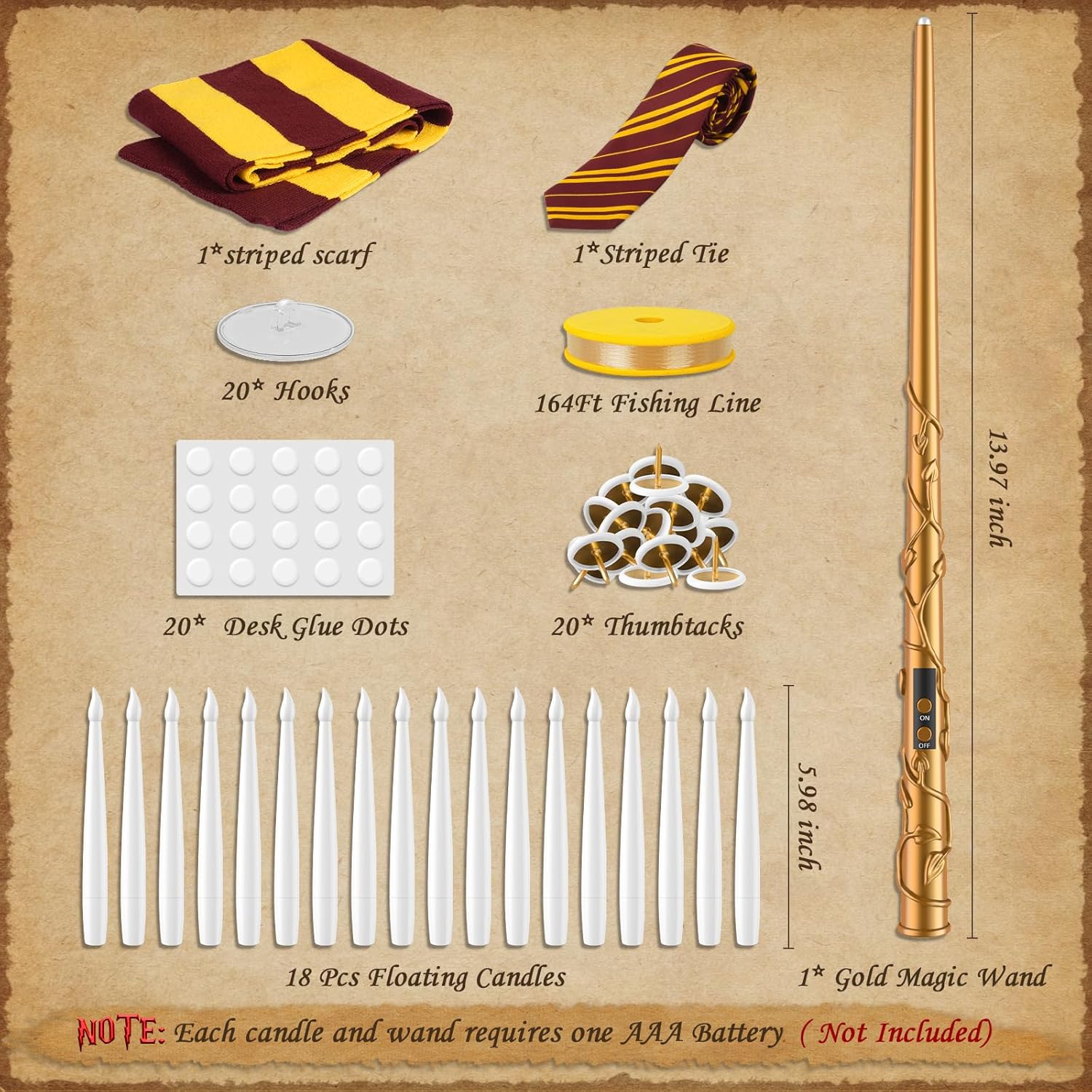 - The TLPUHU Floating Candle Set is perfect for Halloween cosplay party, Christmas gatherings and themed room decorations. This MAGICAL CANDLE SET INCLUDES: 18 * Flameless Candles, 1 * Gold Wand Remote, 1 * Well-made Scarf and Tie, they are perfect for kids or adults to dress up as their heart idols on Halloween, transporting you to nostalgic magical movie scenes and adding a touch of movie magic to your celebration.