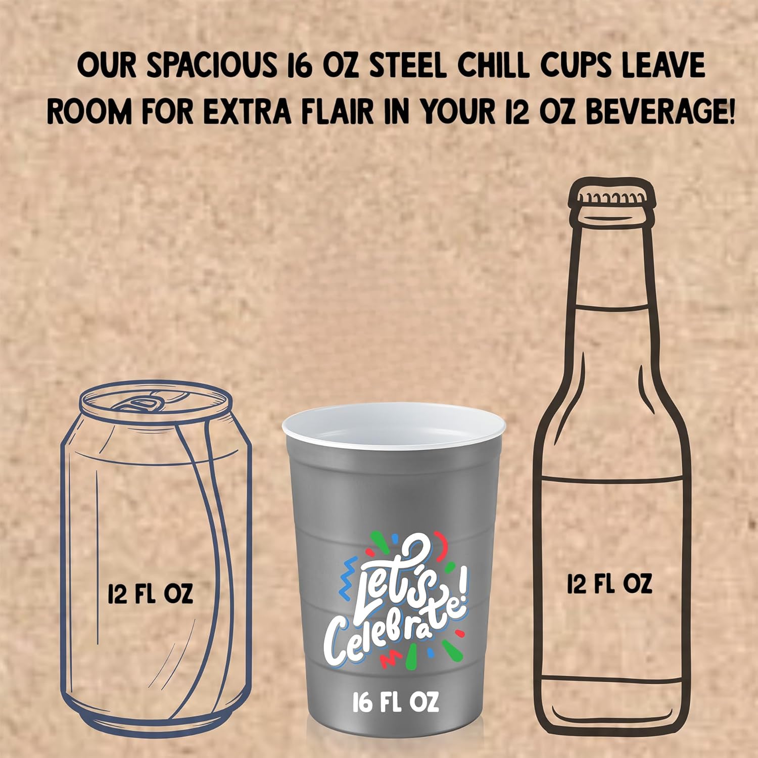 - Earth-Friendly Drinkware: Unlike plastic party cups that end up in landfills, sustainable celebratory Steel Chill Cups are 100% recyclable; reuse hand-washable cups for your corporate event