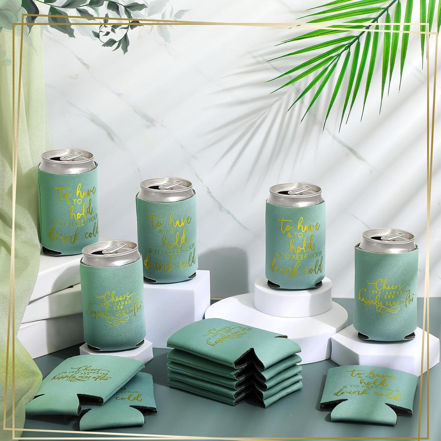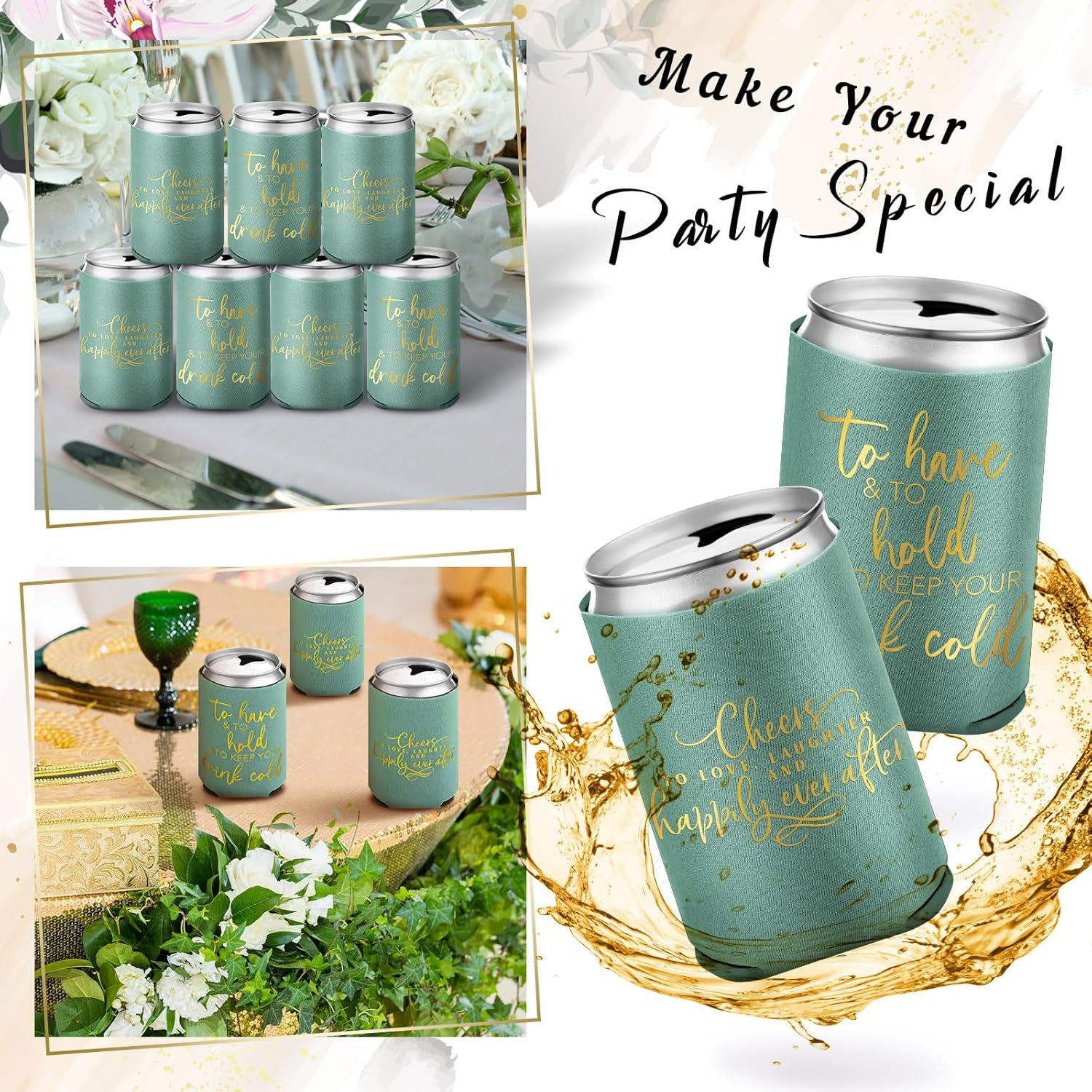 - Satisfying Party Package: our huge package containing 50 pieces of wedding can cooler decorations; Make every drink a celebration with our green and gold can coolers; They are suited to uplift the atmosphere at weddings, bridal showers, and bachelorette parties