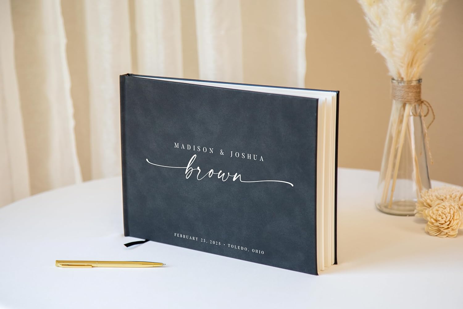- Capture your special moments with our Personalized Guest Book, designed in a cloudy charcoal hardcover with a soft, velvety texture for a modern look. Measuring 11.5" x 8.5", this guest book features custom bride and groom names, including the couple’s last name in a cursive font, adding a unique and personal touch to your wedding decorations.