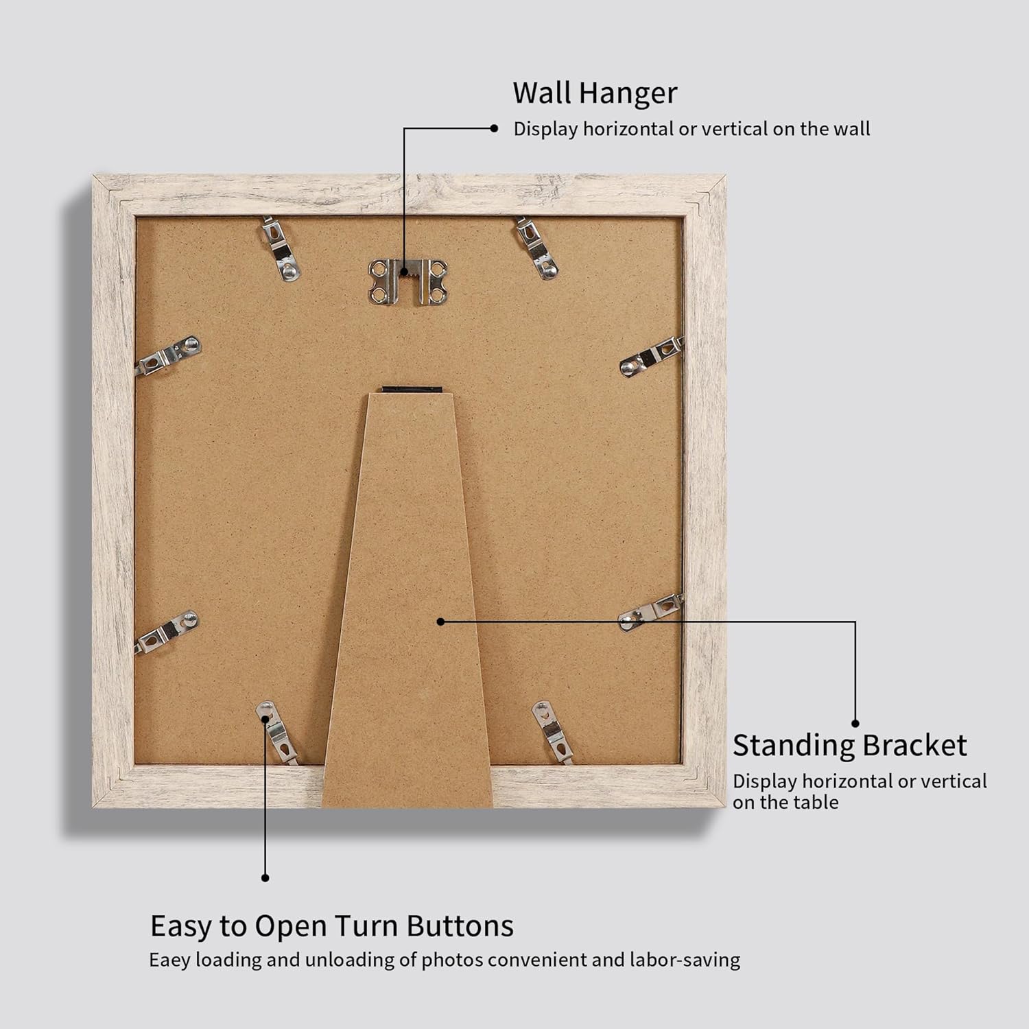 - Multi Frames Collage Set: Includes 4 frames in the same size. Perfectly fits 8x8 inch pictures with mat or 10x10 inch without mat. The frame opening display size is 0.5 inches smaller than the photo size for secure mounting.