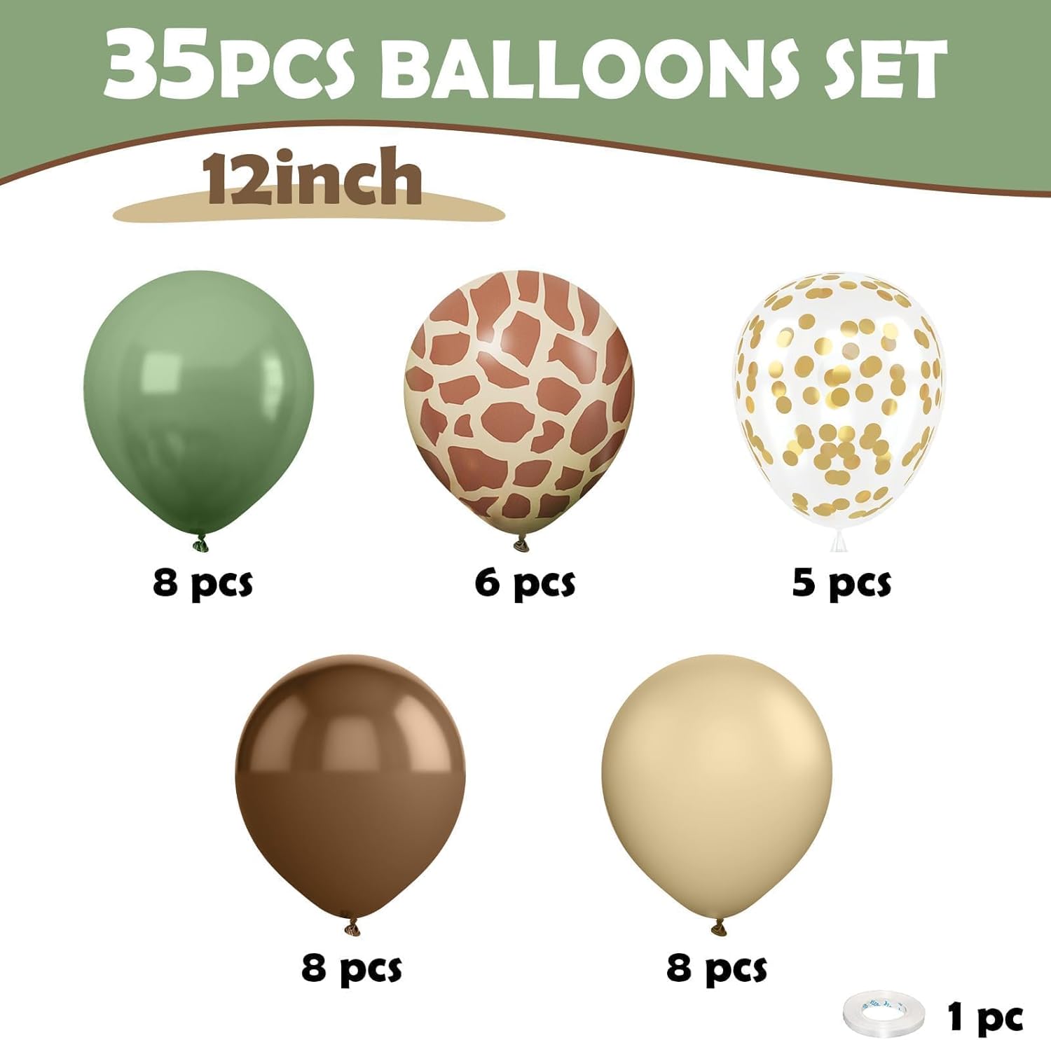 - Green And Brown Balloons: Package comes with 12 inch dark green balloons (8 pcs), apricot balloons(8 pcs), brown balloons (8 pcs),deer print balloons(6 pcs),white balloon ribbon (1 roll). Just enjoy your party with these green and brown balloons.