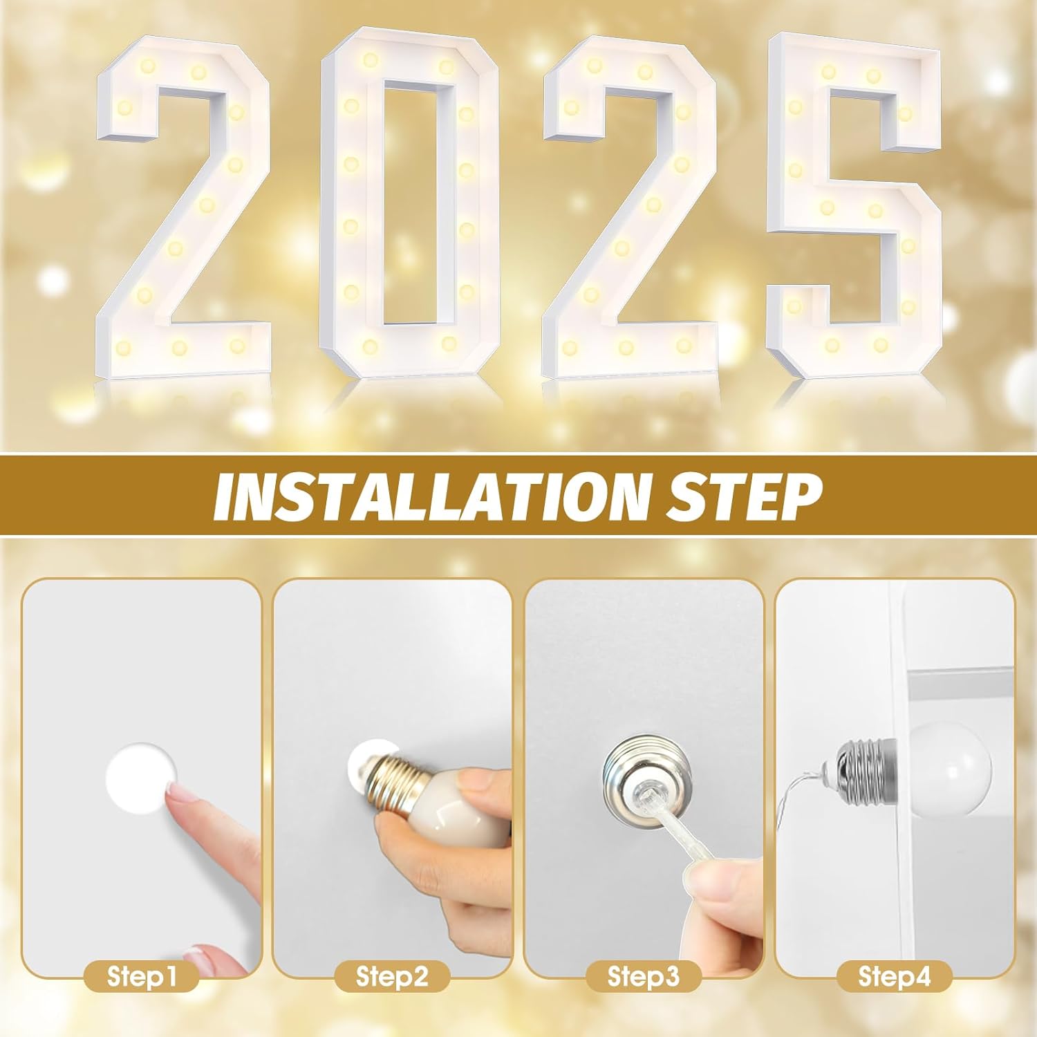 - 【Assembly Required】Each marquee numbers is made of precisely pre-cut foam board, comes with the same model of light string and LED bulb, and a user-friendly instruction manual. According to our installation manual, ① Fold the side panels along the cutting line and stick them to the bottom panel with hot melt glue according to the corresponding number. ② Screw the bulb onto the single board, and then install the LED light string into the bulb. (Note: Glue gun and battery not included)