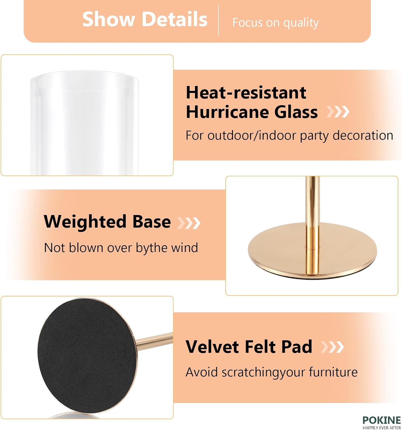 - Understated and Classic Glass Candlestick Holder: Chic gold candle holder matches well with removable thick hurricane cylinder.Different height candlesticks, The visual effect of the high and low undulating candlelight gives you a wonderful feeling.Add a more romantic atmosphere to your dates, parties, holiday celebrations and anniversaries.