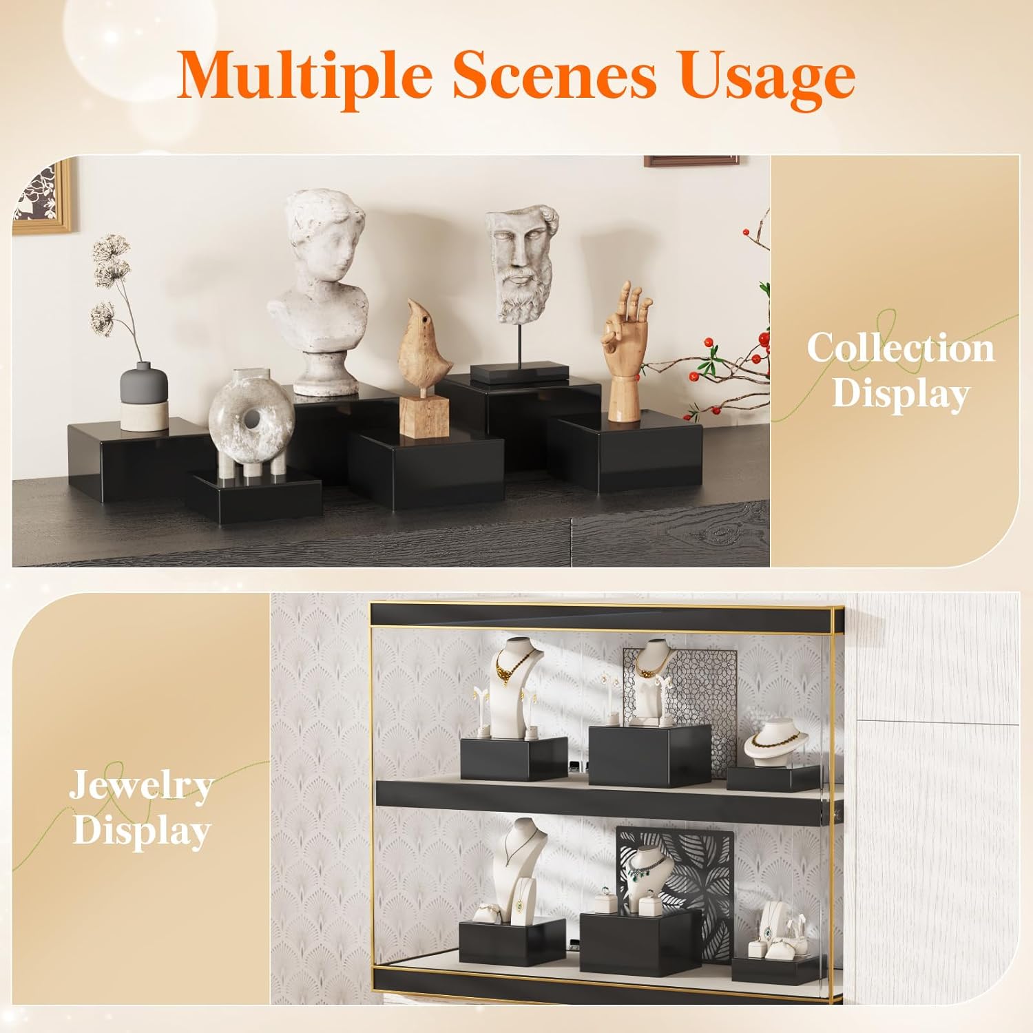 - Versatile Use: Beyond showcasing cakes and other foods, these buffet risers and stands can also display collectible figurines, sculptures, jewelry, and crafts. They can be inverted as storage boxes for cosmetics, office supplies, and more
