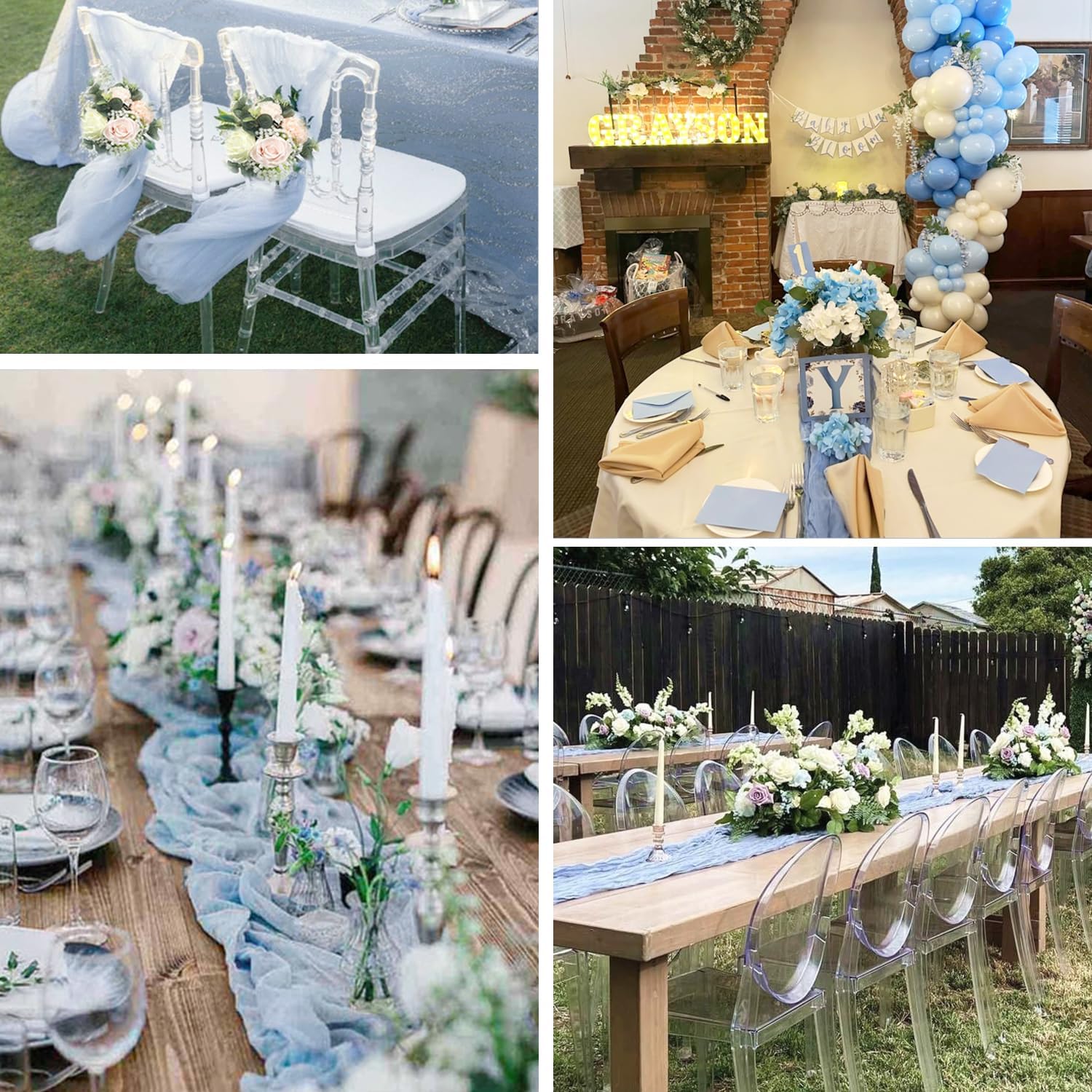 - 🍸【Versatile Cheesecloth Table Runner】This boho dusty blue table cloths table runner is perfect for any event, including weddings, banquets, bridal or baby showers, wedding arches, receptions, candy buffets, dessert backdrops, shows, photo booths, ceremonies, and many more special events&holidays. It can also be applied to spicing up chair frames, home curtains, fireplace, shelf, cabinet, TV stand, sofa, bedside table, and any other furniture that needs a romantic touch. It's an excellent addition to any event decoration and gives a touch of elegance to your overall decor that is both romantic and charming.