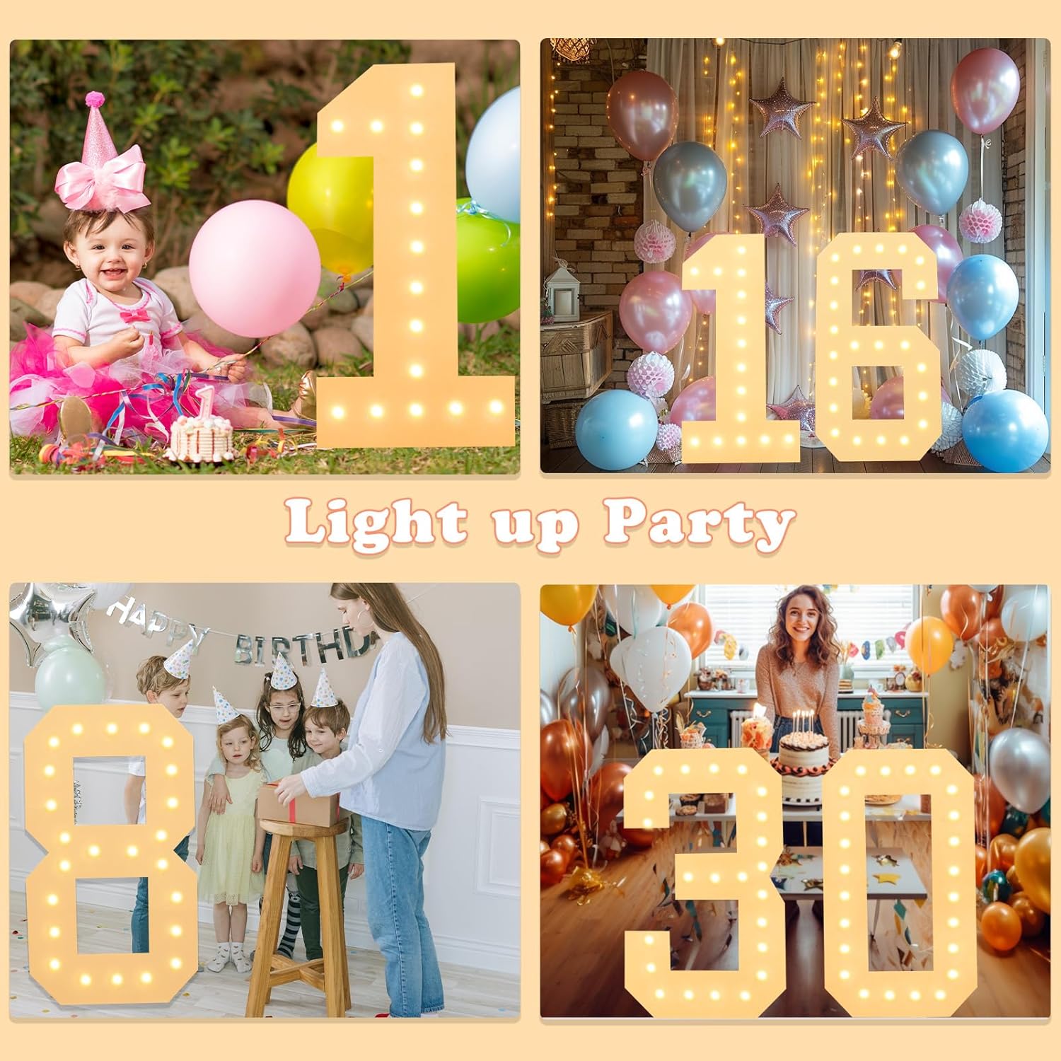 - Perfect Party Backdrop: Our latest marquee numbers light up numbers can be placed on ground steadily with back stands. Put weight on the bottom stands to reinforce for ground display. LED marquee number with simple design can complement any party theme