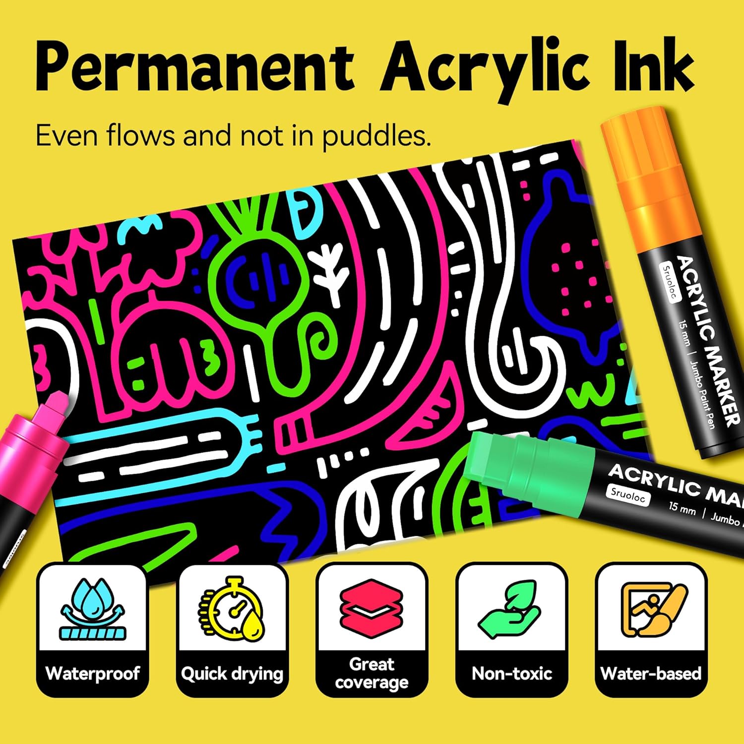 - Jumbo Markers Set: SRUOLOC jumbo markers are made with the highest quality water-based acrylic ink. That is waterproof, quick-drying, permanent , and smooth flow