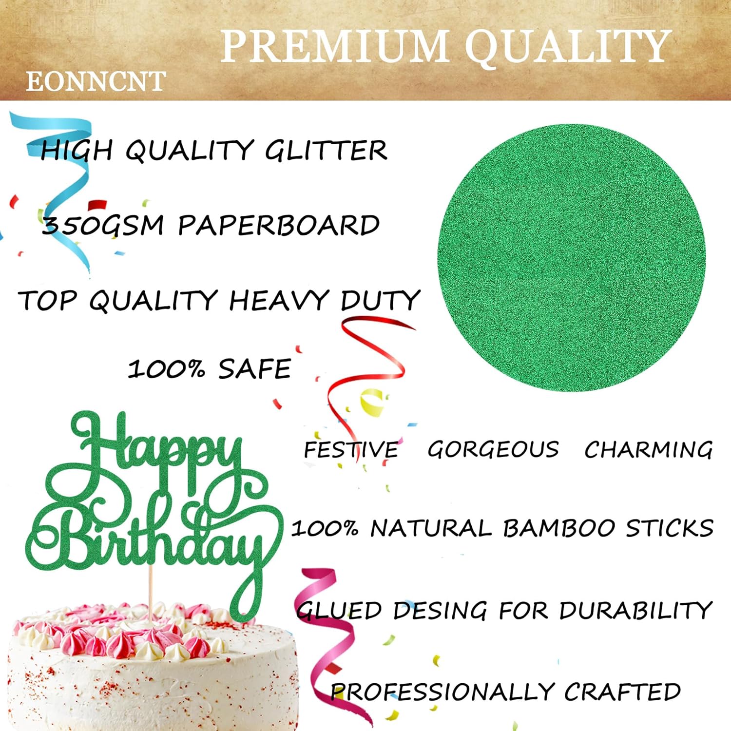 - HIGH QUALITY CARDSTOCK - Each happy birthday cake topper is made of green 350GMS thick cardboard, which is sturdy and durable, effectively preventing damage during transportation. This happy birthday cake topper is a true green flash that shines from every angle, providing a unique touch and illuminating the entire gathering venuedecor