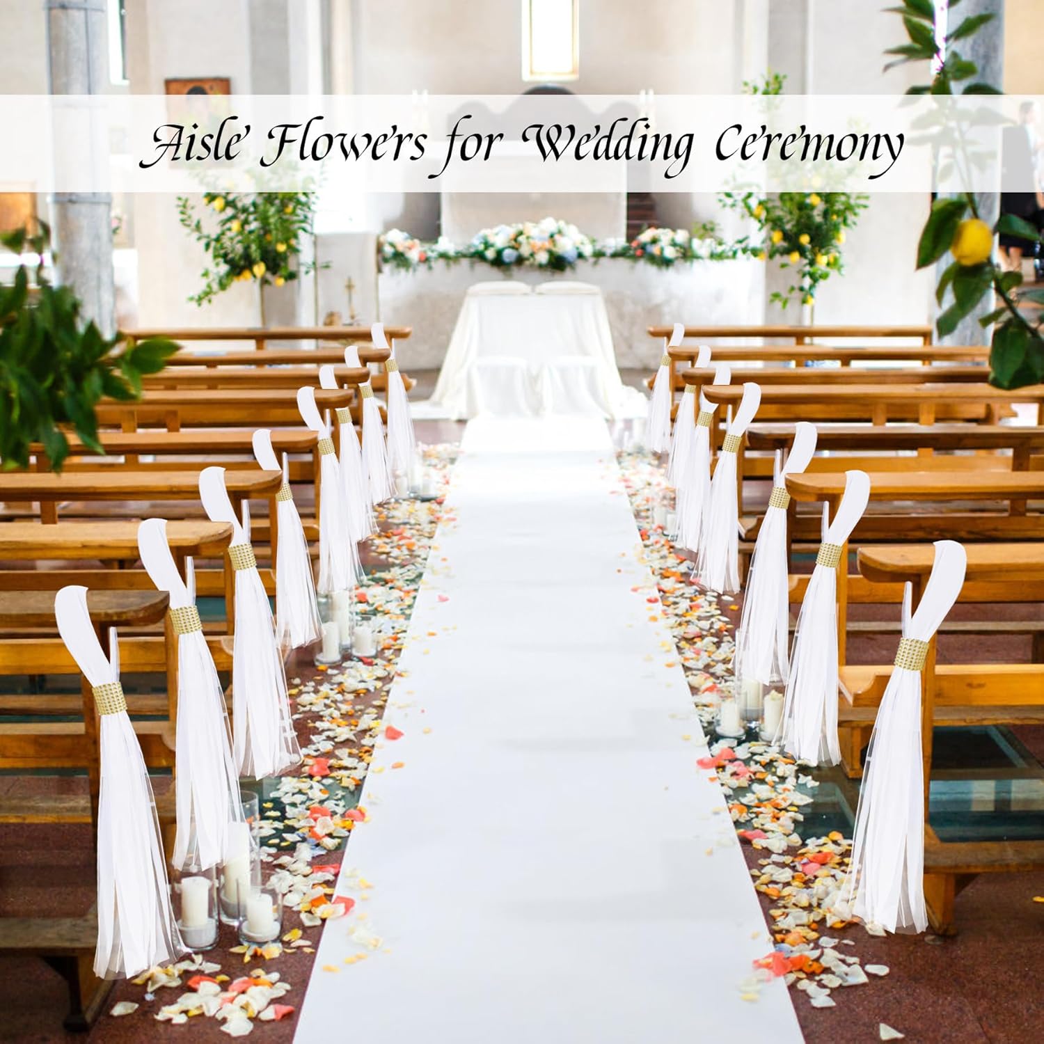 Large White Pew Bows Tulle Wedding Aisle Chair Decorations, Extended Church Pew Decor Aisle Flowers Runner for Weddings Ceremony Outside Decorations (38, Gold Wrap)