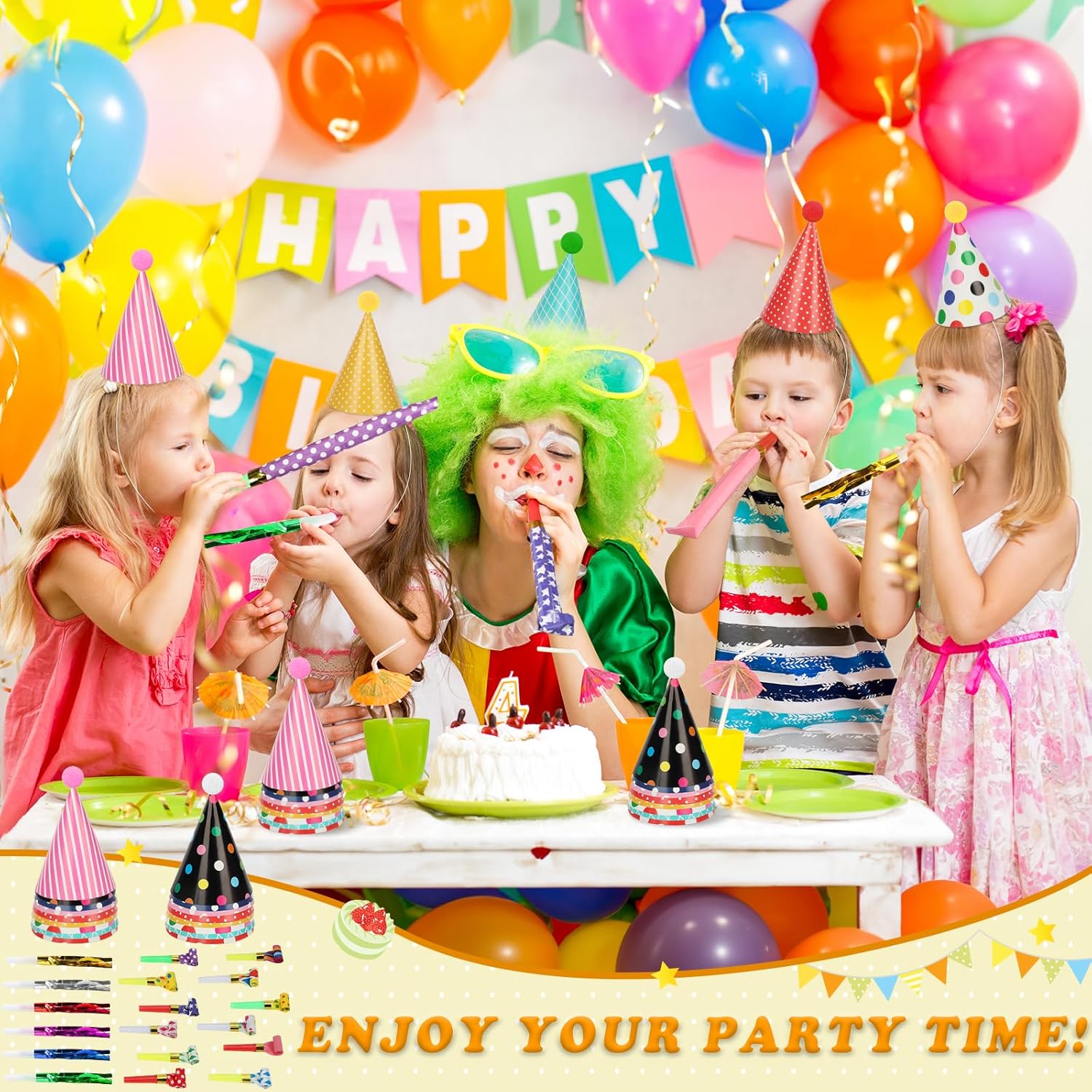 116 PCS Birthday Party Cone Hats Assorted Colors Cone Paper Hat with Colorful Blowers and Metallic Fringed Noise Makers Blowouts for Kids Adults Birthday Baby Shower Party Supplies