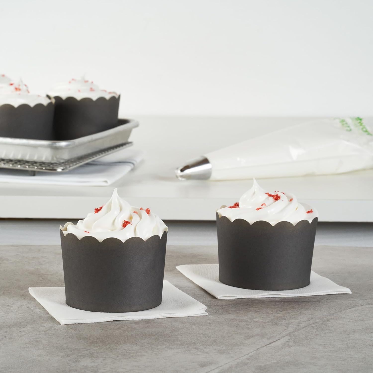 - SUSTAINABLE OPTION: Great for ecologically-conscious bakers! These disposable baking cups are made from sustainable paper material and the gray finish blends in with any type of cupcake decoration.