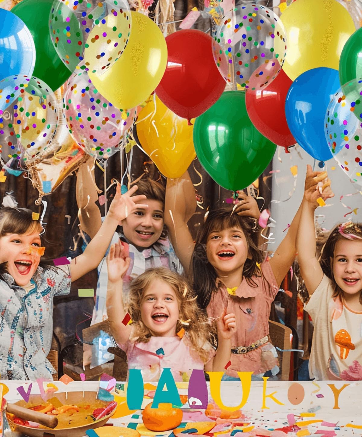 - Vibrant Balloon Set: This 300-piece set, 60 of each color, includes 12-inch Red Yellow Blue Green Balloons and Colourful Confetti Balloons