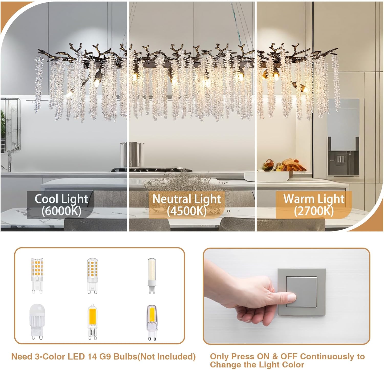 - 【Dimmable G9 Bulbs Compatible】This branch chandelier Does Not include light bulbs. It requires 14pcs G9 bulbs, recommended to use 3000K warm white light bulb. Dimming can be achieved when using dimmable bulb with a compatible dimmer switch