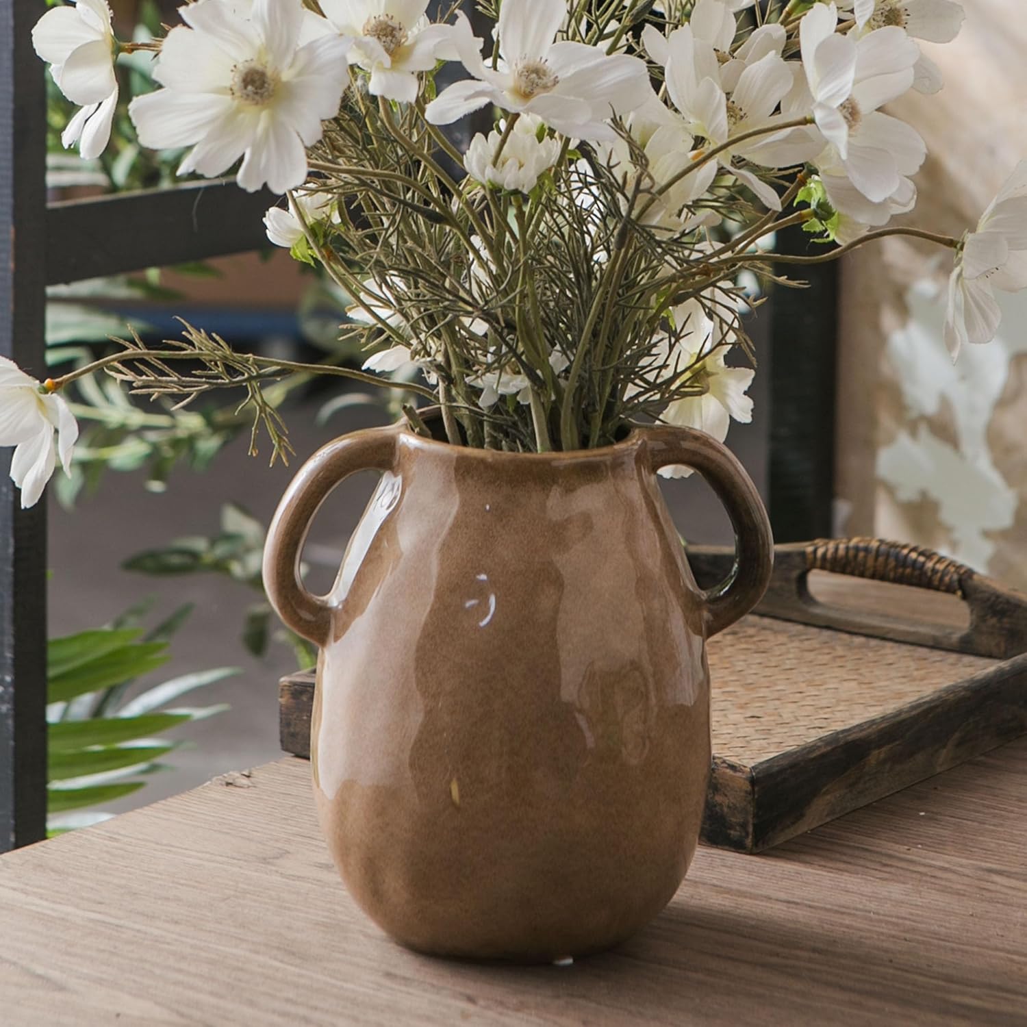Brown Ceramic Vase with 2 Handles for Modern Farmhouse Home Decor, Vintage Rustic Decorative Vases, Small Vase for Fresh and Dried Flowers, Centerpiece Table Decorations, 7 Inch