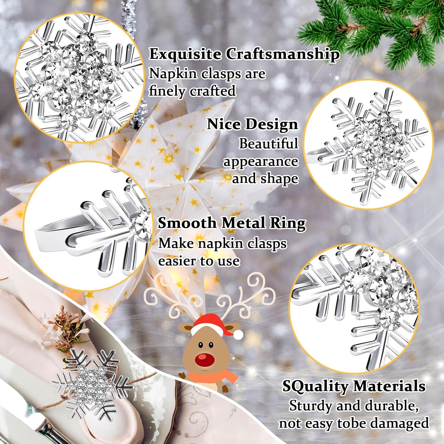 - Sturdy Material & Beautiful Design: These adorable Christmas napkin rings are made of metal which are sturdy and durable. Sparkling White rhinestones are set in the center of the snowflake. They shine in the light and add an elegant splash of color to your table.