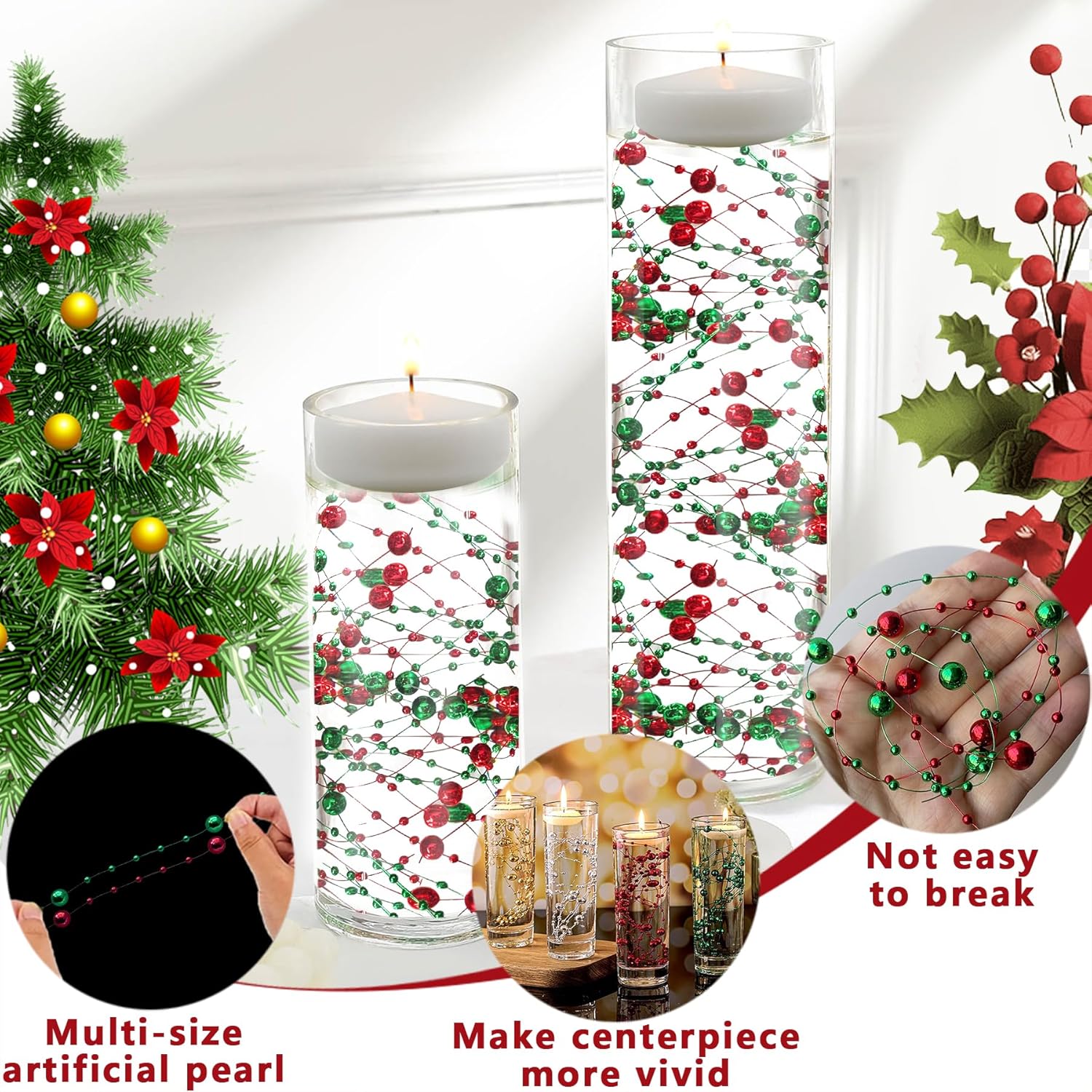 50 PCS Artificial Floating Beads for Centerpieces Vases, 8+3mm String Beads for Christmas Party Pearl String for Decoration, Red & Green String Pearls for Crafts Vase Fillers