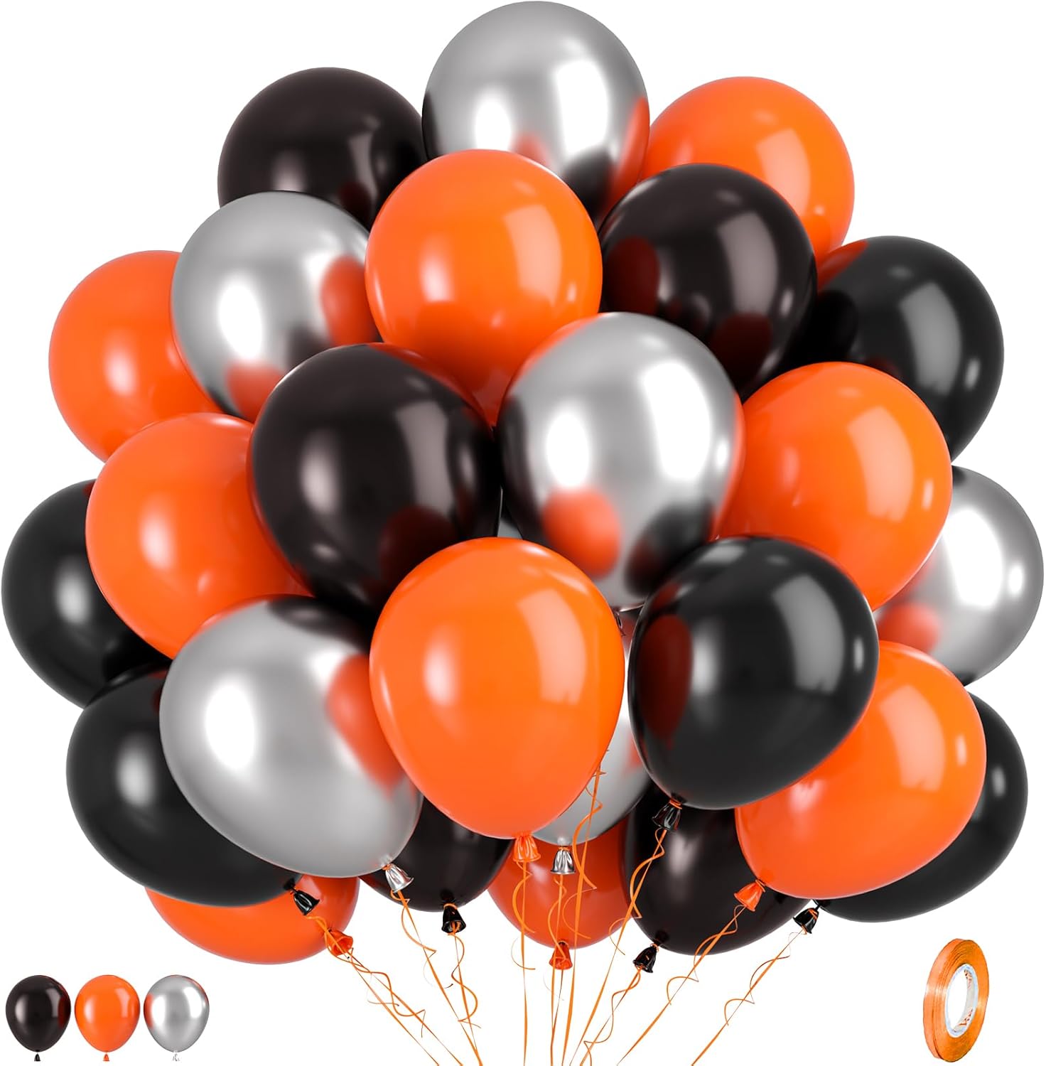 - 12 inch Black and Orange Balloons Set: 17pcs matte orange balloons, 17pcs matte black balloons, 16pcs metallic silver balloons, 1pcs orange ribbon in our party balloons set. From birthday to wedding, make your events unforgettable with our top-notch, reliable balloons that add a touch of elegance and fun.