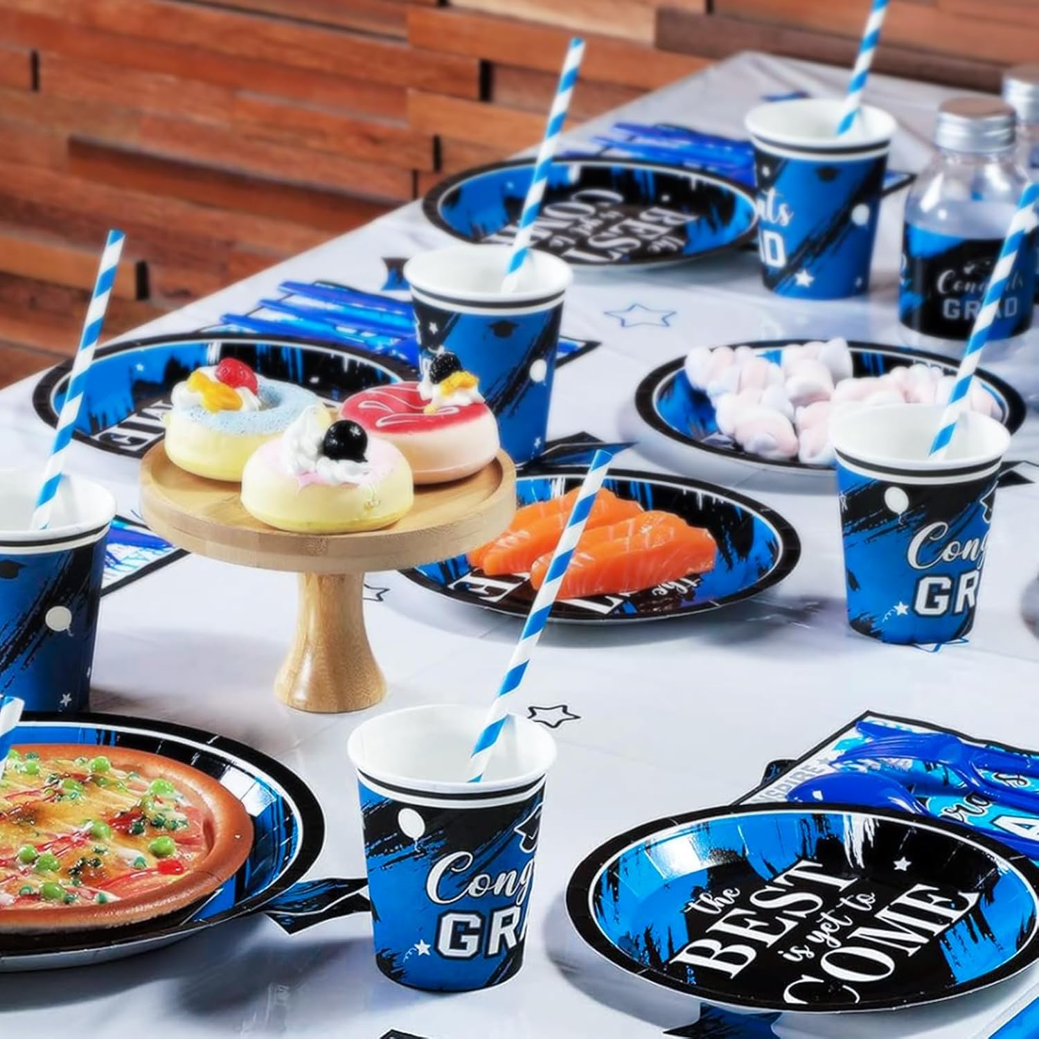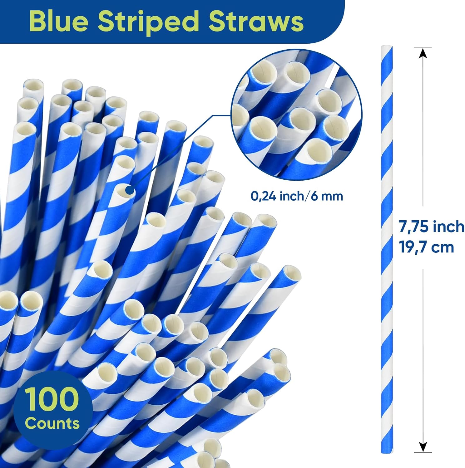 Blue Stripes Disposable Paper Party Straws for Drinking 7.75 inch 100 Counts, Compostable - for Cocktail, Coffee, Juice