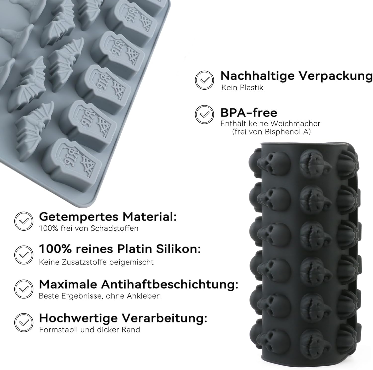 (2 Pack) Silicone Halloween Molds, 96-Cavity Pumpkin Ghost Wizard Hat Bat Spider Tombstone Skull Halloween Silicone Gummy Molds For Chocolate, Fondant, Cupcake Decoration, Biscut - Black&Gray