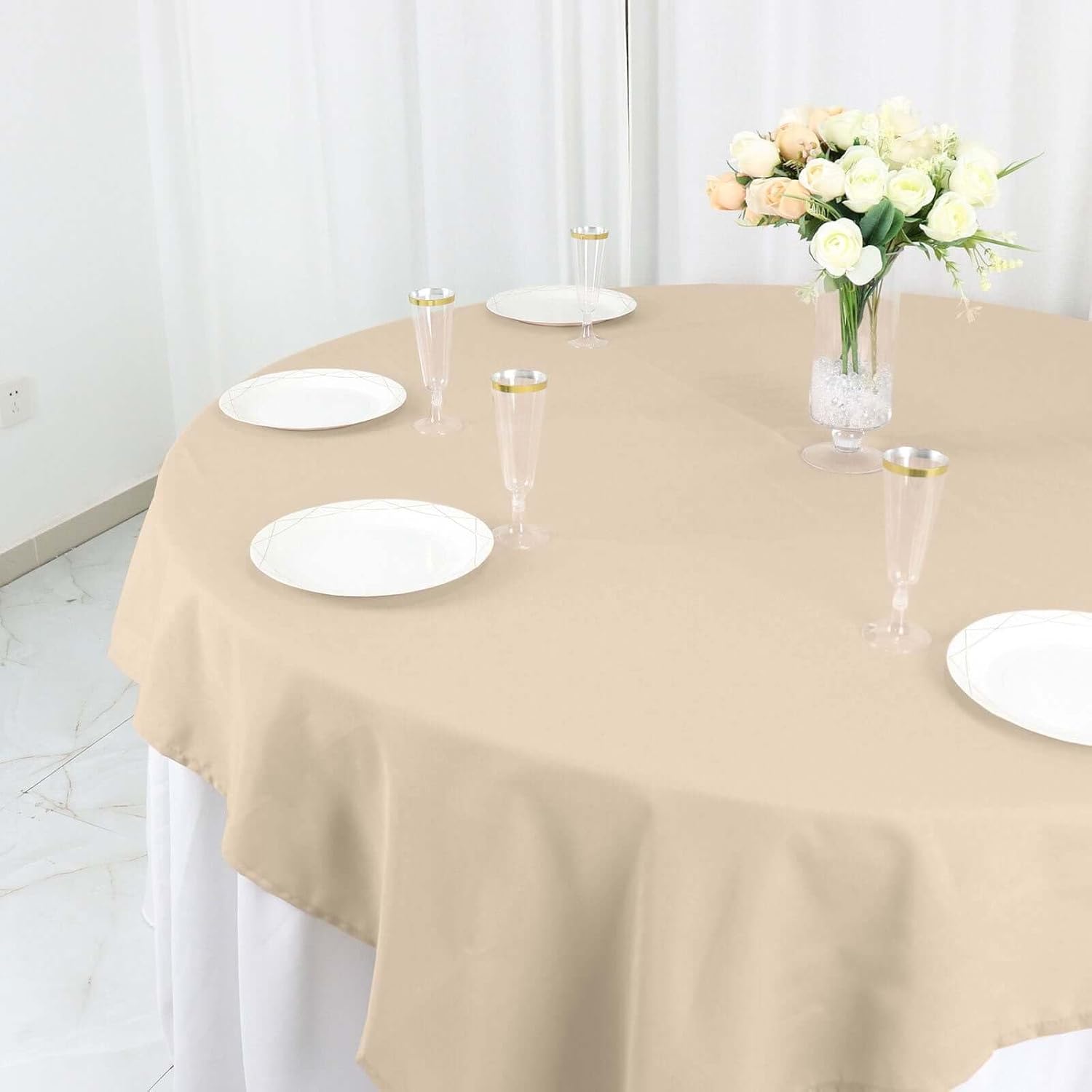 - Quantity: 1 Square Tablecloth Material: 100% Polyester Color: Nude Size: 70" x 70" Thickness: 130 GSM Stain & wrinkle resistant, machine washable 1 piece, seamless design Hemmed edges for an exquisite look.
