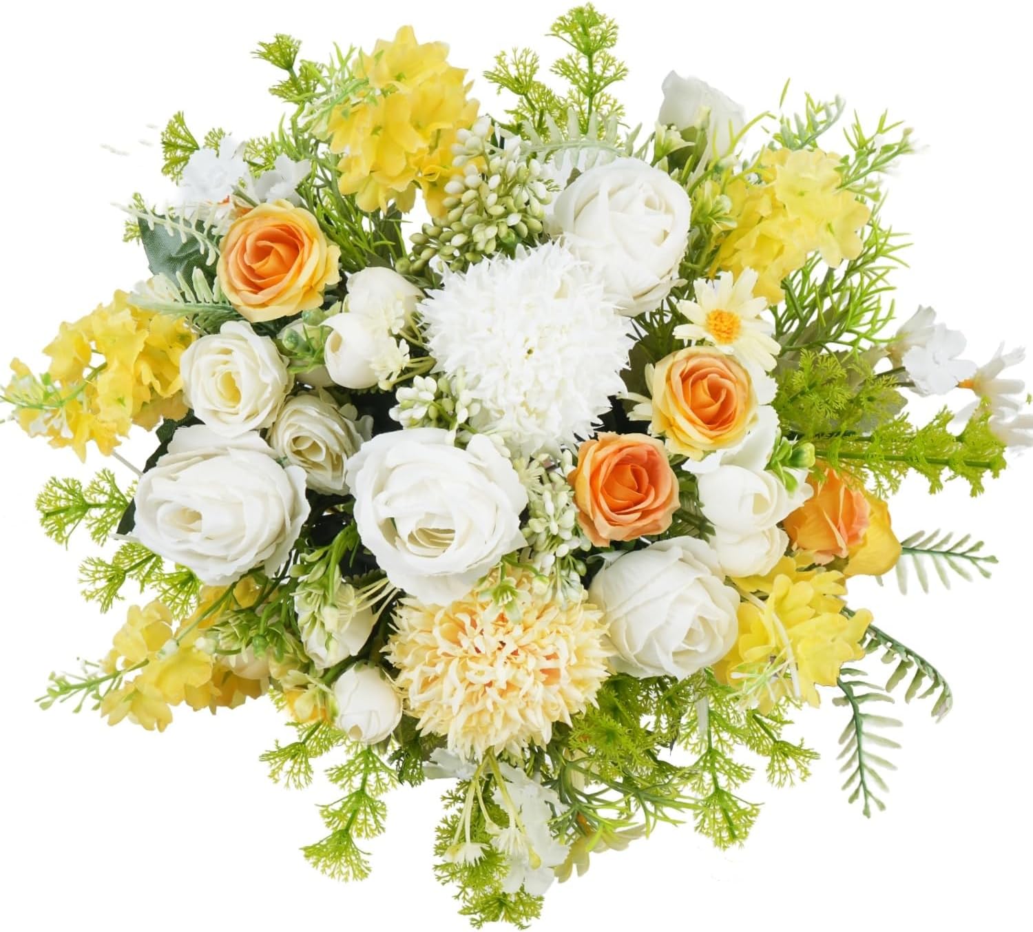 - [Multiple collocation]:Faux flower bouquet showcases a harmonious blend of chrysanthemums, delicate roses, vibrant daisies, and graceful yellow hyacinths.