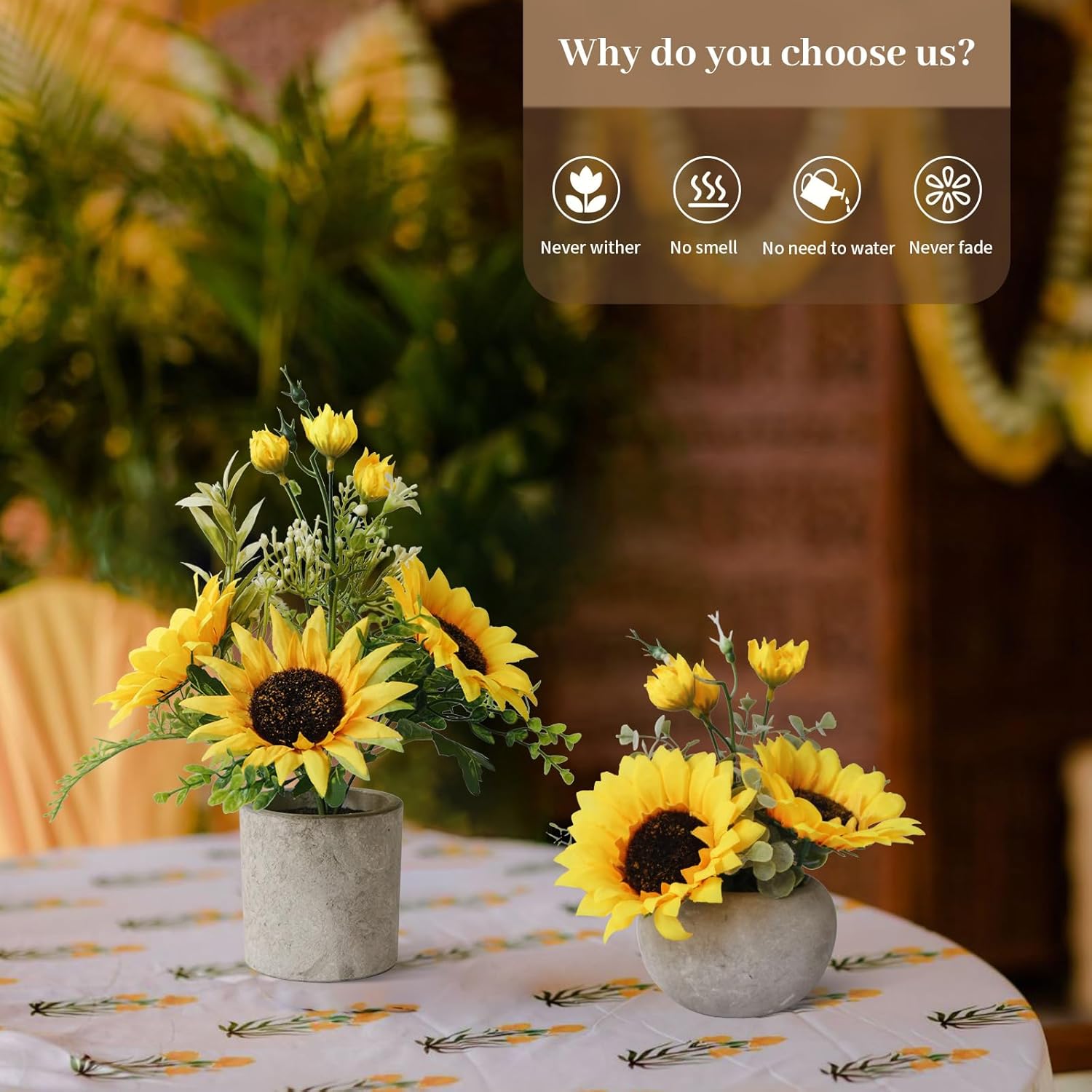 - Don't Worry:Faux Sunflower may have been crushed and deformed during transportation,Please spread the petals with your hands and wait for some time to recover. If there are any unresolved issues,Please feel free to contact us at any time