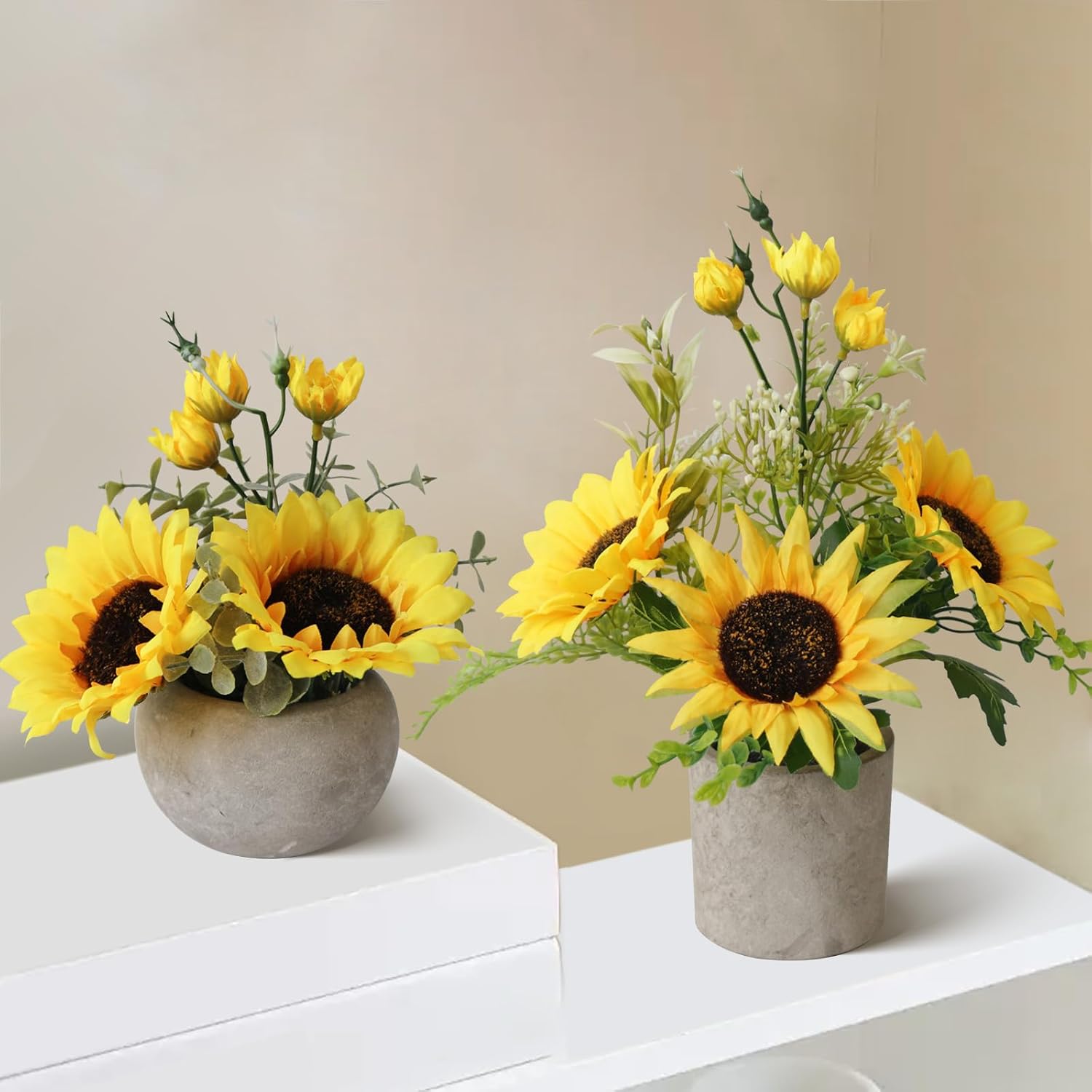 - Package:2 Pcs Sunflowers artificial flowers pot set includes 5 pcs fake flowers,Some small flowers,Plants and eucalyptus for sunflower kitchen decor;sunflower bathroom decor;summer decorations for home;yellow decor