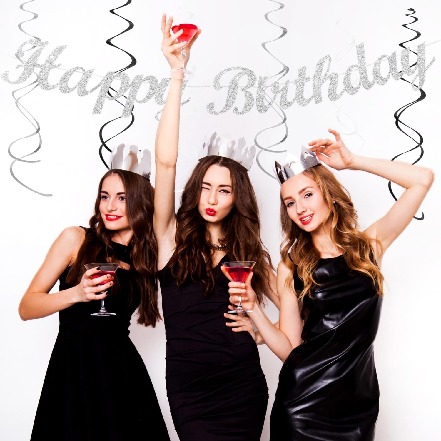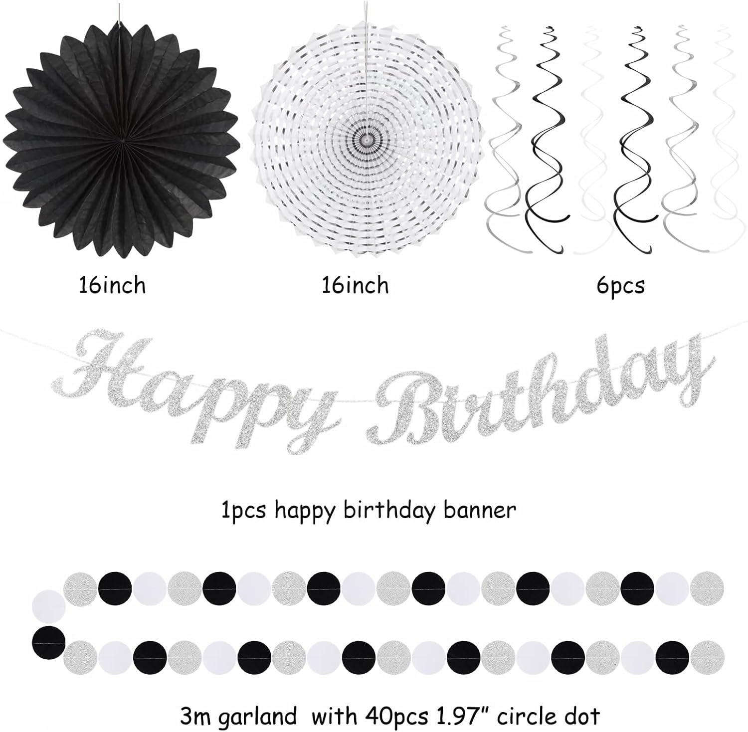 - 【Black white silver birthday kits】This kits include 1pcs happy birthday banner, 1pcs circle dots paper banner, 4pcs tissue pom poms: 3pcs 10" and 1pcs 12" , 3pcs 8inch paper honeycom ball, 2pcs 8inch paper lantern, 4pcs 12inch paper flower fan, 6pcs Paper swirls hanging streamers.