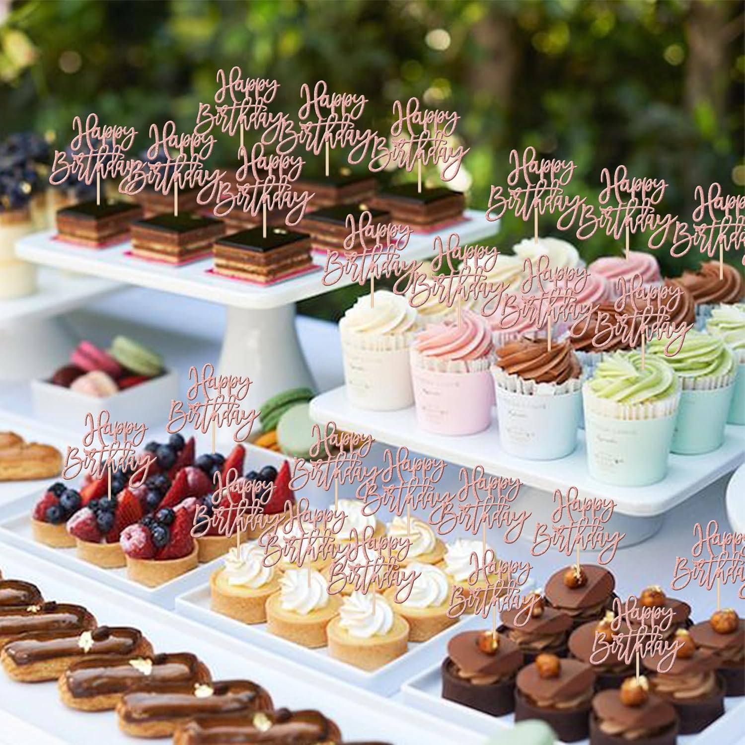 24 PCS Happy Birthday Cupcake Toppers Glitter Picks for Celebrating Anniversary Theme Party Cake Decorations Supplies Rose Gold