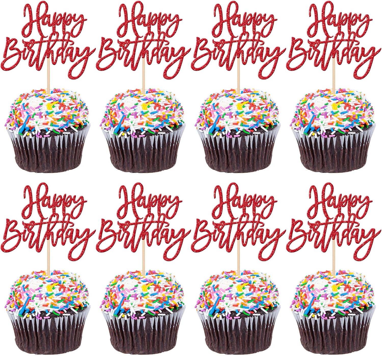 24 PCS Glitter Cupcake Toppers - Happy Birthday & Anniversary Picks - Red