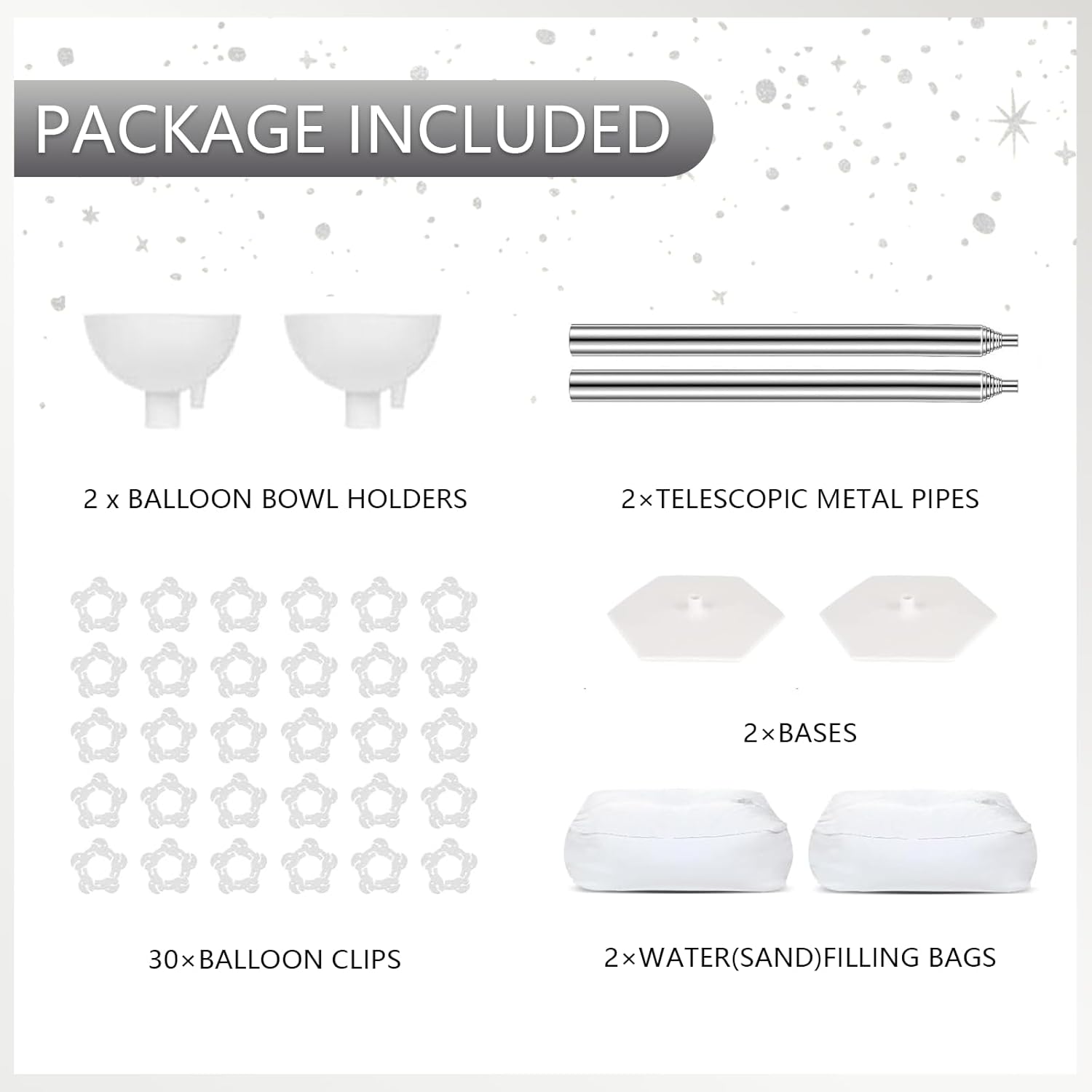 - Balloon Column Kit Includes: The balloon arch package includes 2 x metal telescopic pipes, 2x Hexagonal bases, 2 x Water (sand) fillable bag, 2 x balloon bowl holders, 30 x Balloon clips. Elevate your party decoration with our balloon column stand kit—perfect for weddings, birthdays, graduations, and any special occasion. This kit is a must-have for anyone looking to make their event unforgettable!
