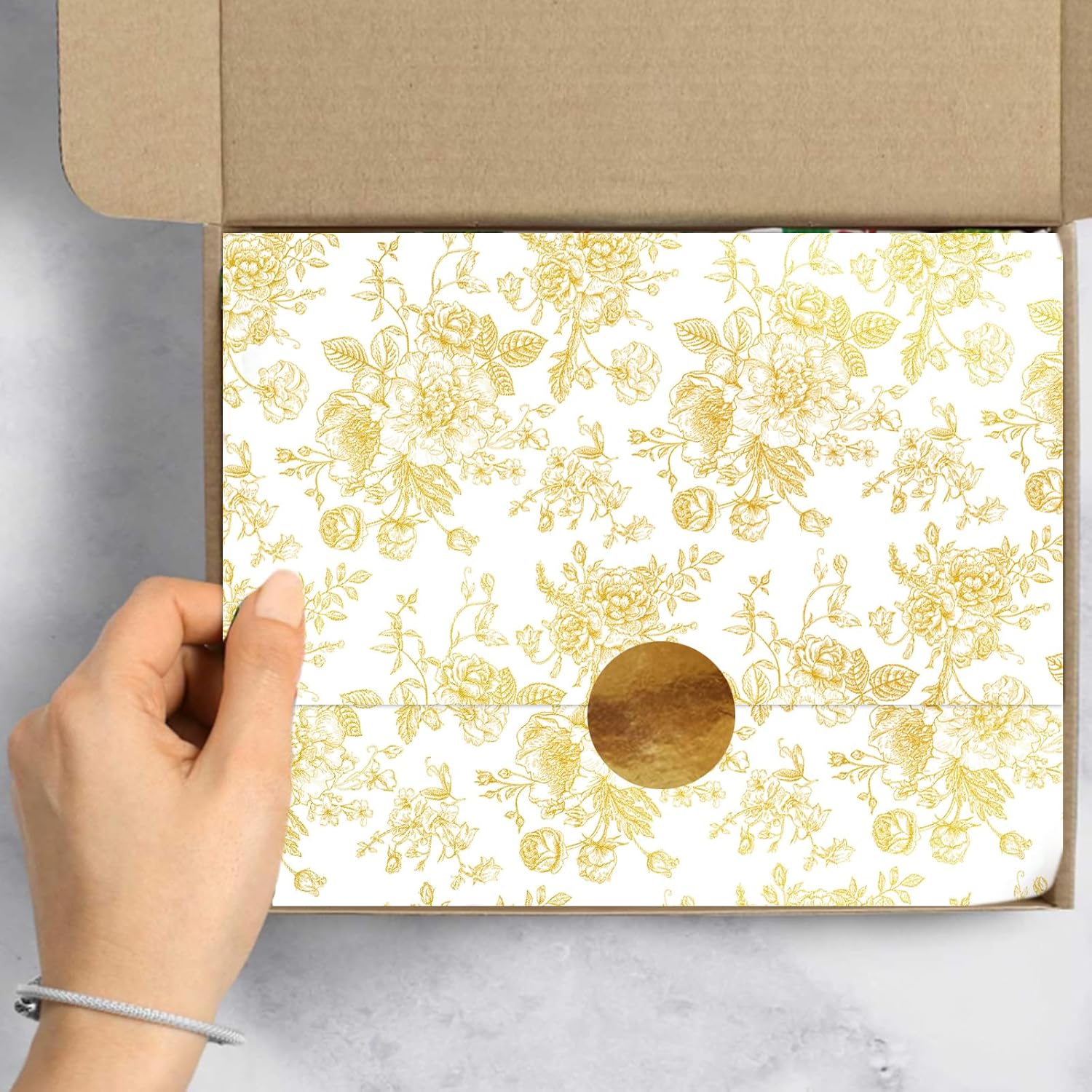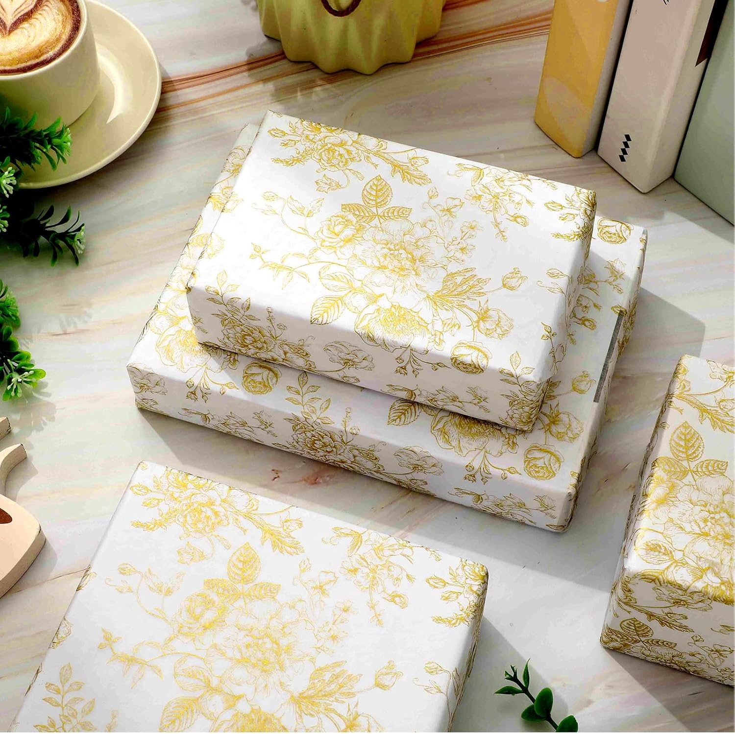 JarThenaAMCS 100 Sheets Floral Tissue Paper Gold Flower Gift Wrapping Paper Vintage Decorative Art Paper for Home Party DIY Crafts Supplies, 14 x 20 Inch
