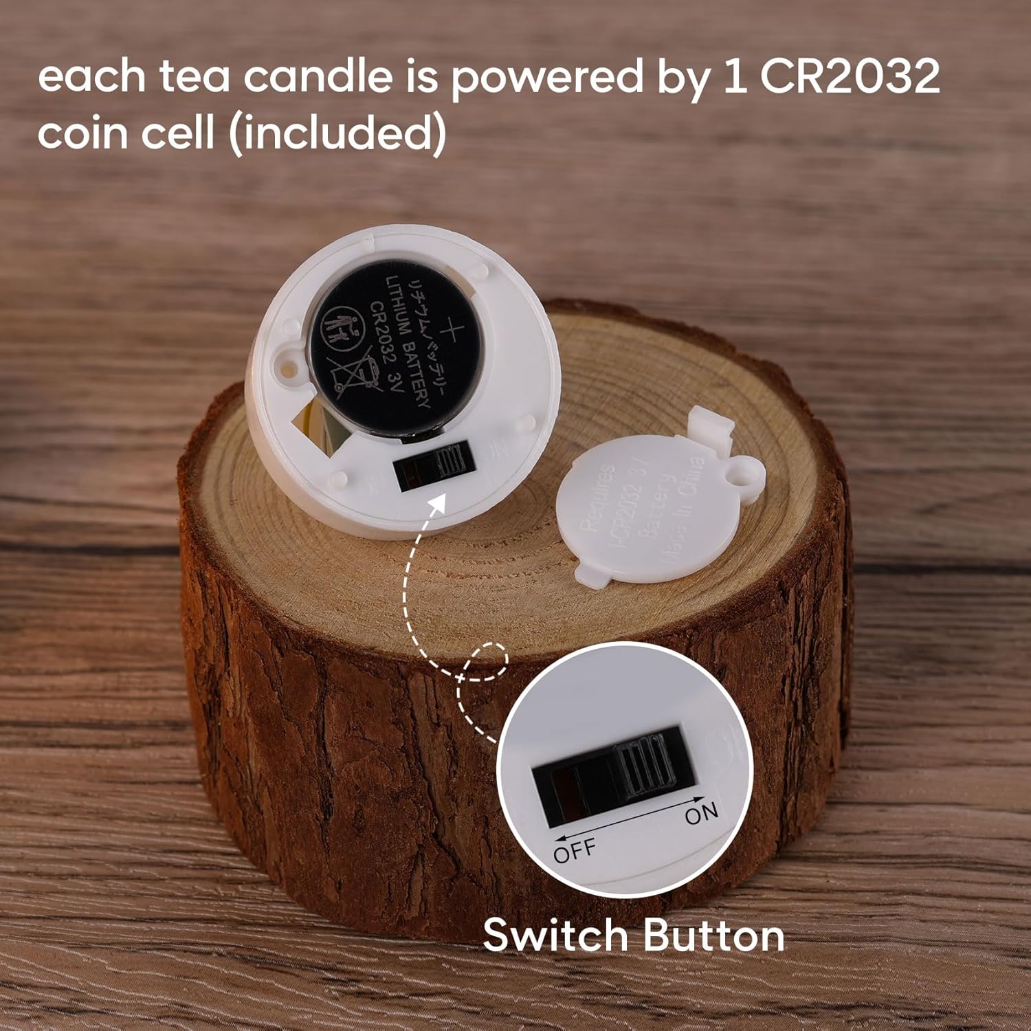 - Batteries Included: each white tea candle takes 1 cr2032 coin cell (included), lasting over 150 hours, remote takes 1 cr2025 coin cell (included)